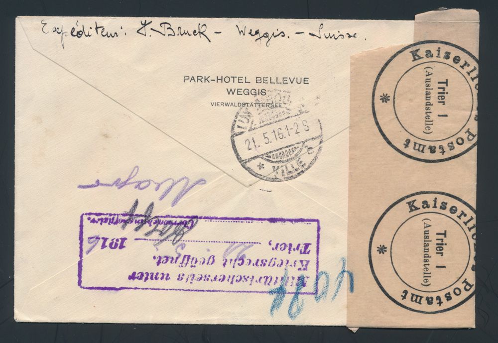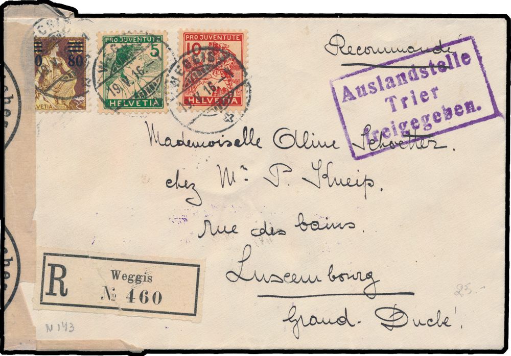 4129 image1916 Beautiful registered letter from Weggis to Luxembourg, cancelled three times in Trier, interesting franking with Yv. n° 148/50 (stamp value 150!), vf(Image 1) (Image 2)