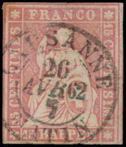 4121 0 imageN° 24F "1857 - Strubeli - 15rp. light matt pink", brown corner, signed Von der Weid, vf/f (Zumstein 450Sfr.)(Image 1)