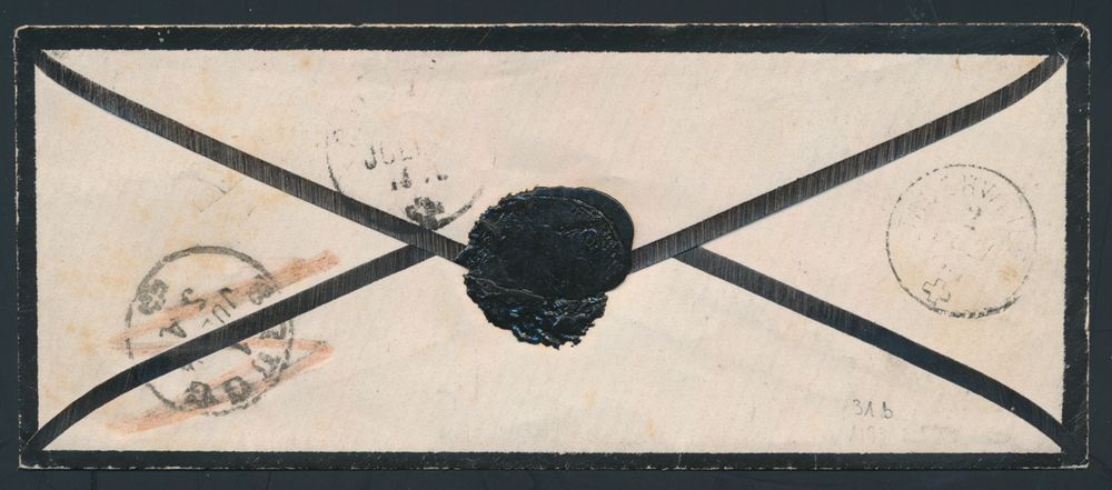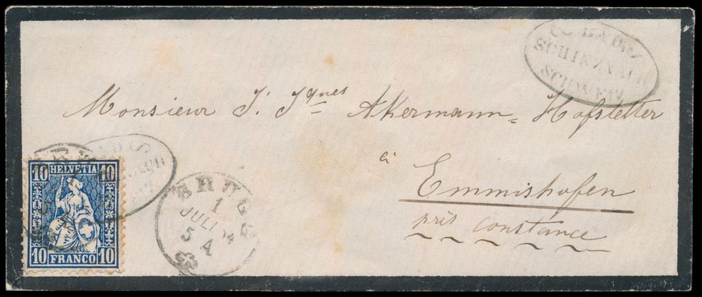 4128 image1864 Small format mourning envelope from Schinznach Bad to Emmishofen with Seated Helvetia 10rp. blue, vf(Image 1) (Image 2)