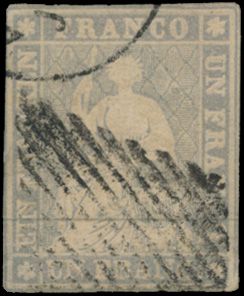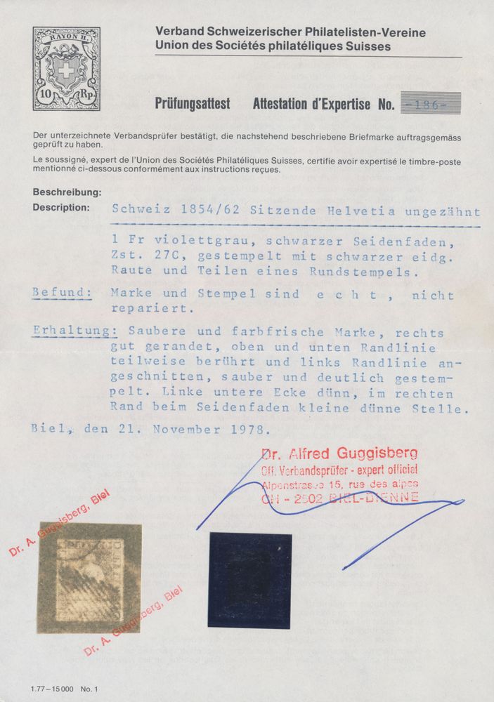 4122 0 imageN° 27C "Strubeli - 1fr. violet grey", margins see photo, 2 thin spots, photo certificate Dr. Alfred Guggisberg, f/to be checked (Zumstein 1,325Sfr.)(Image 1) (Image 2)