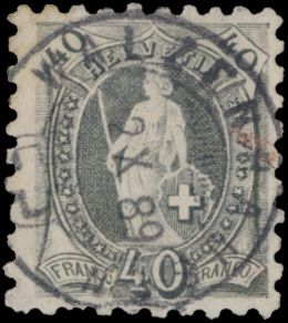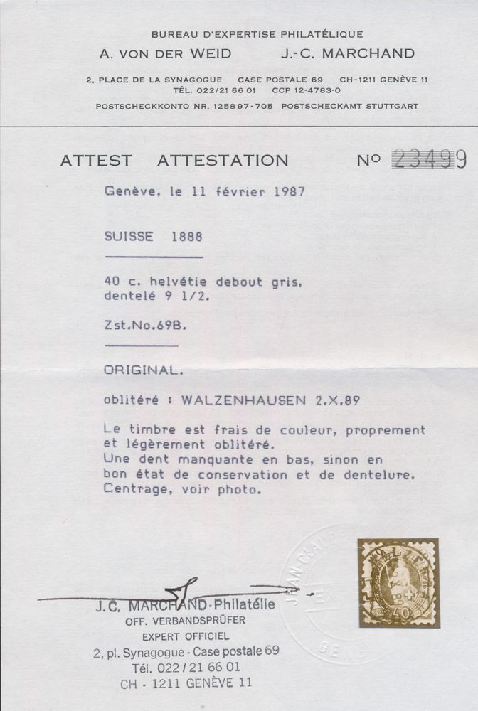 4126 0 imageN° 83 "1888 - Standing Helvetia 40c. grey", perf 9 1/2, cut close perf below, Marchand photo certificate, rare, vf/f(Image 1) (Image 2)