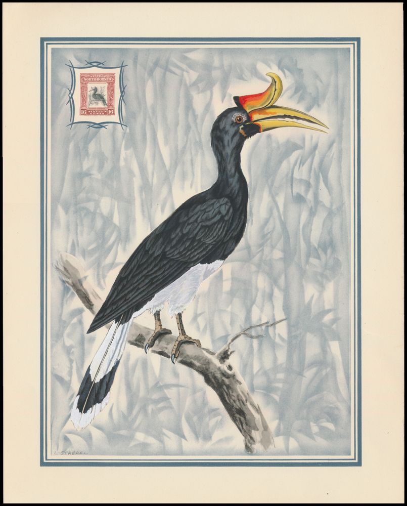 4156 imageBirds: Large format print after Levaillant (1801) with North Borneo "Rhinoceros Hornbill" offset, 16 cents, from the 1949 set, rare, vf(Image 1)