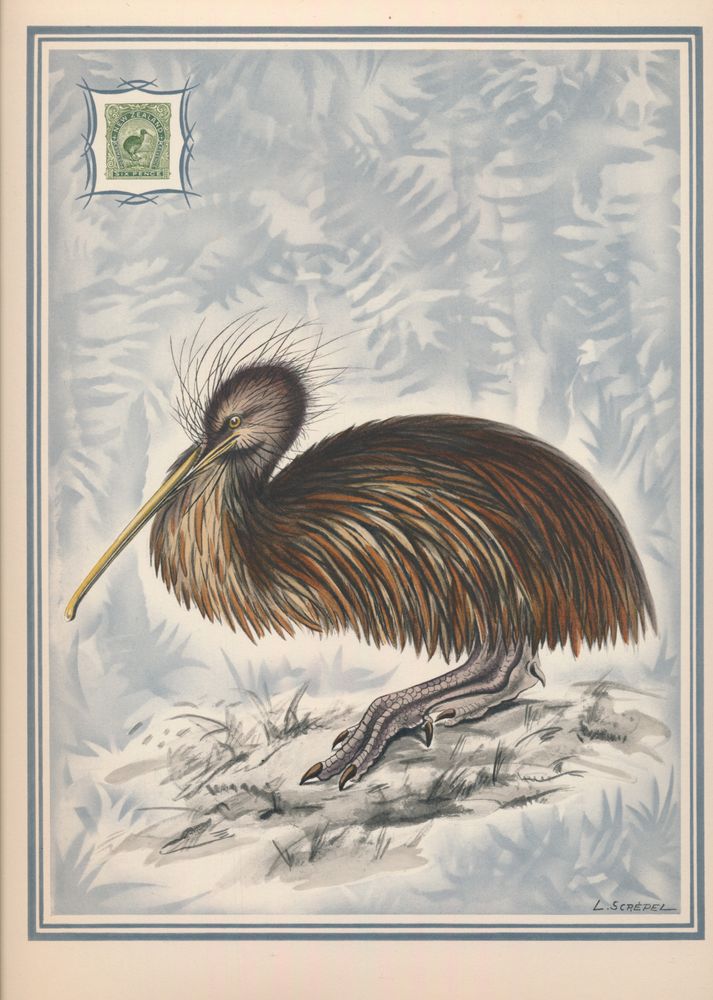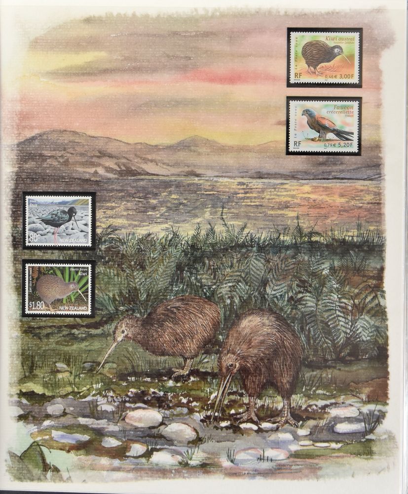 4154 imageBirds: Large format print after J. Gould (1848) with offset New Zealand "Kiwi" stamp, six pence green from the 1949 set, rare, vf(Image 1)