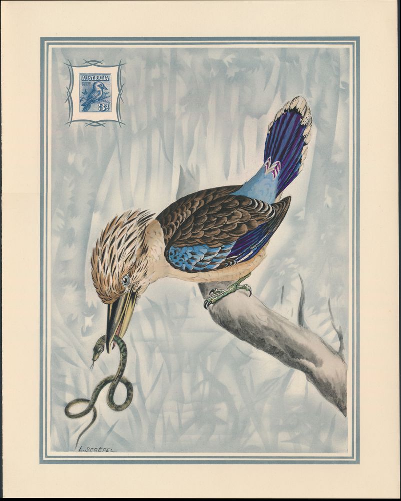 4151 imageBirds: Large format print after J. Gould (1848) with offset of Australia "Kookaburra" stamp, three pence blue, from 1949 set, rare, vf(Image 1)