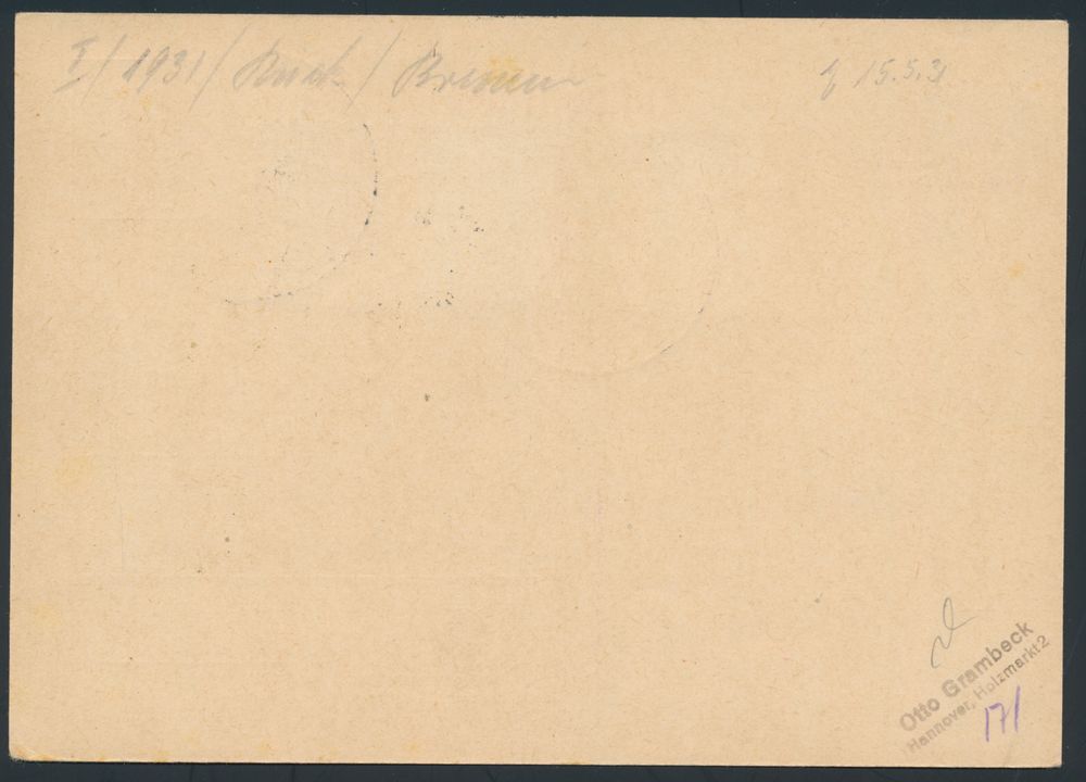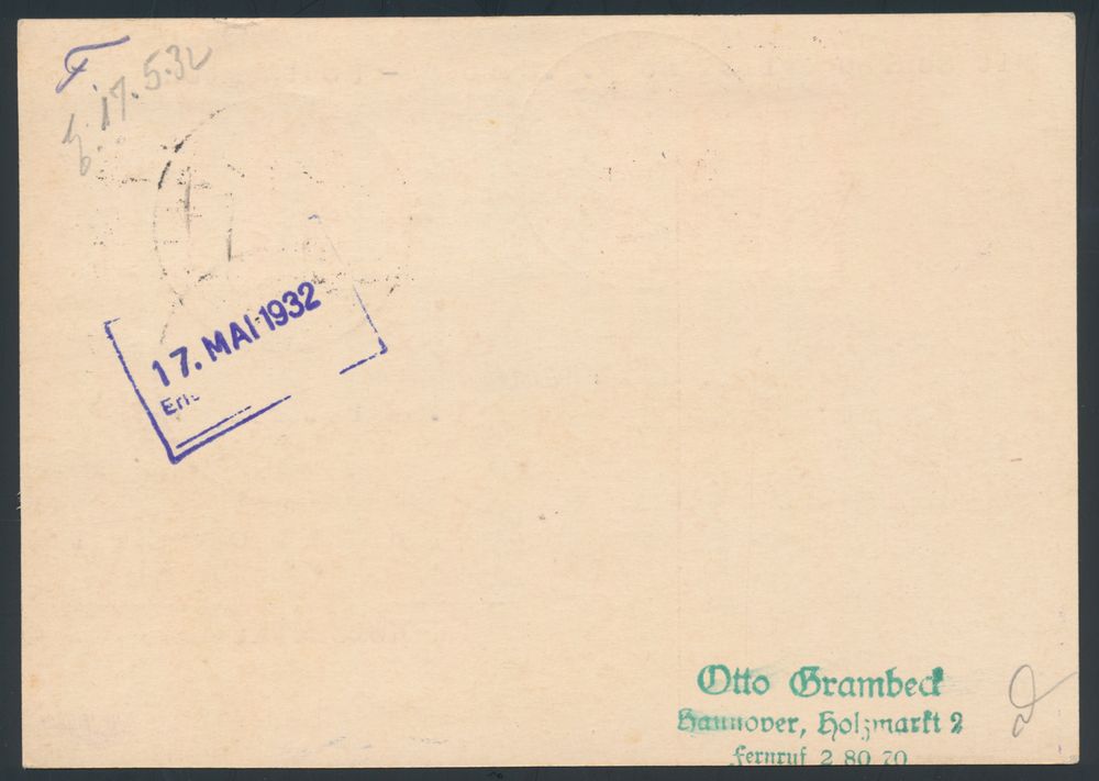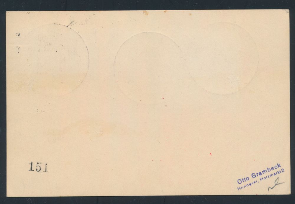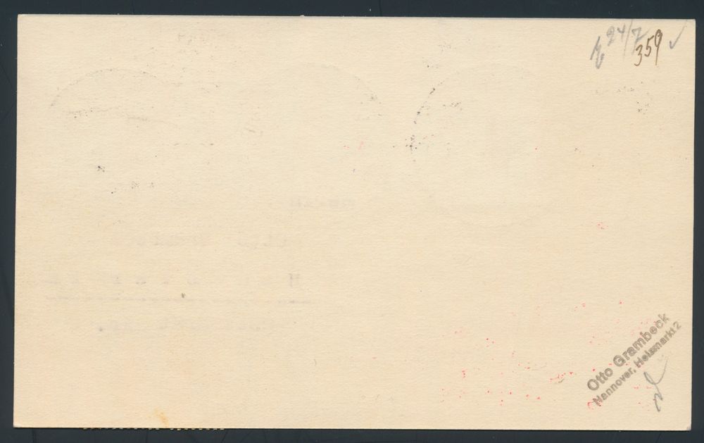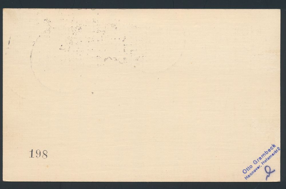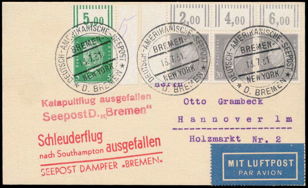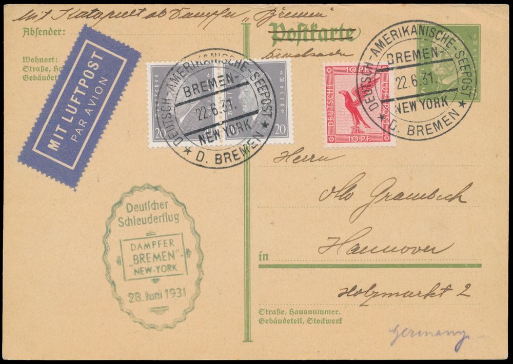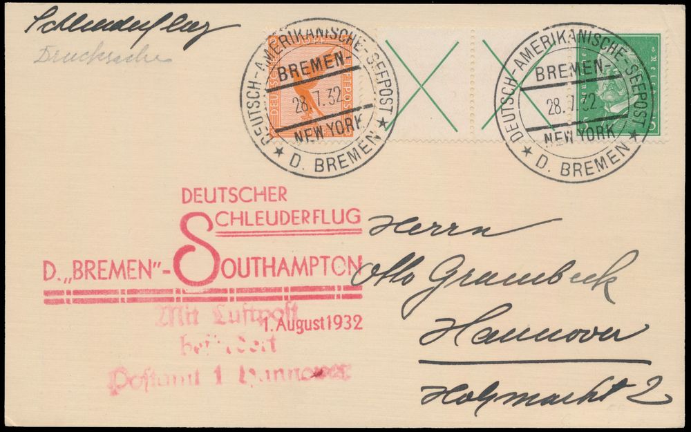 postcard addressed to Hannover and intended to have been launched from the steamer "Bremen", however the flight was cancelled and the mail items prepared for it received one of two special cachets, whereas this postcard has received BOTH cachets in