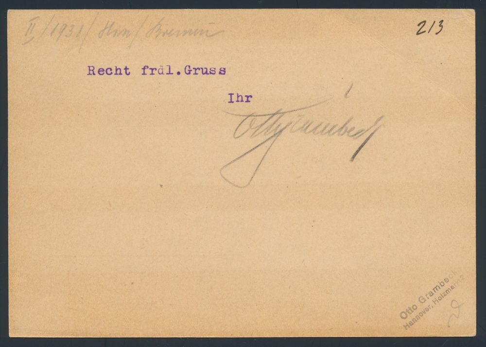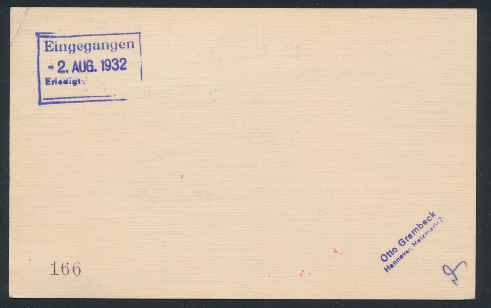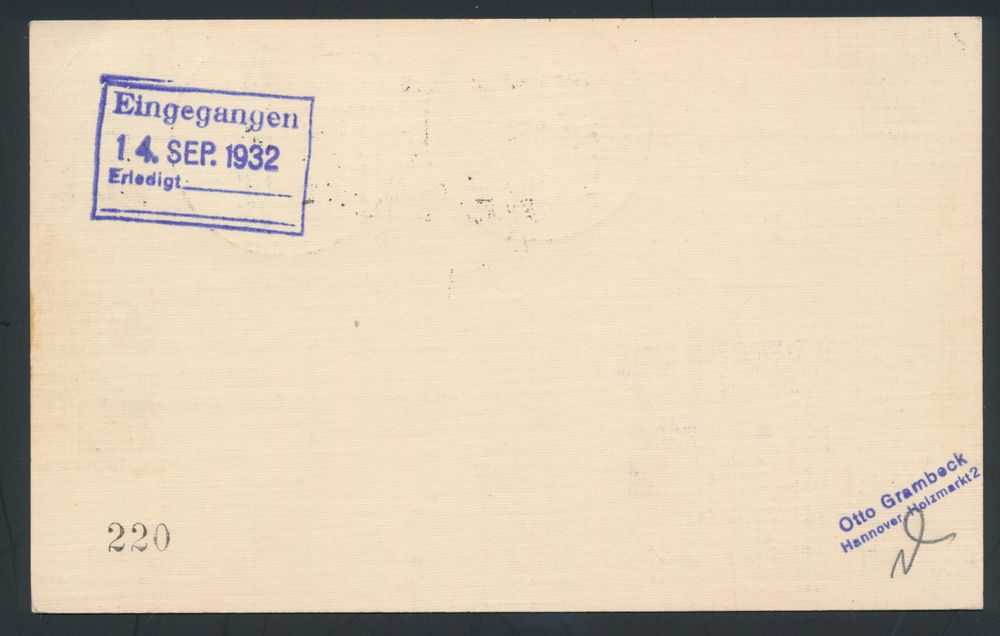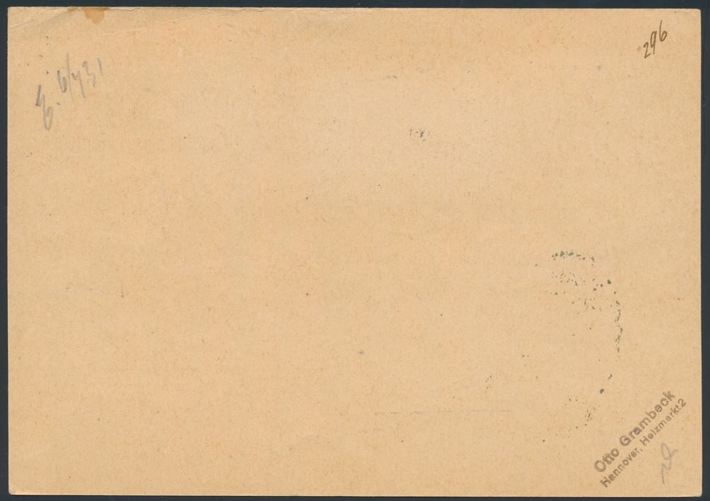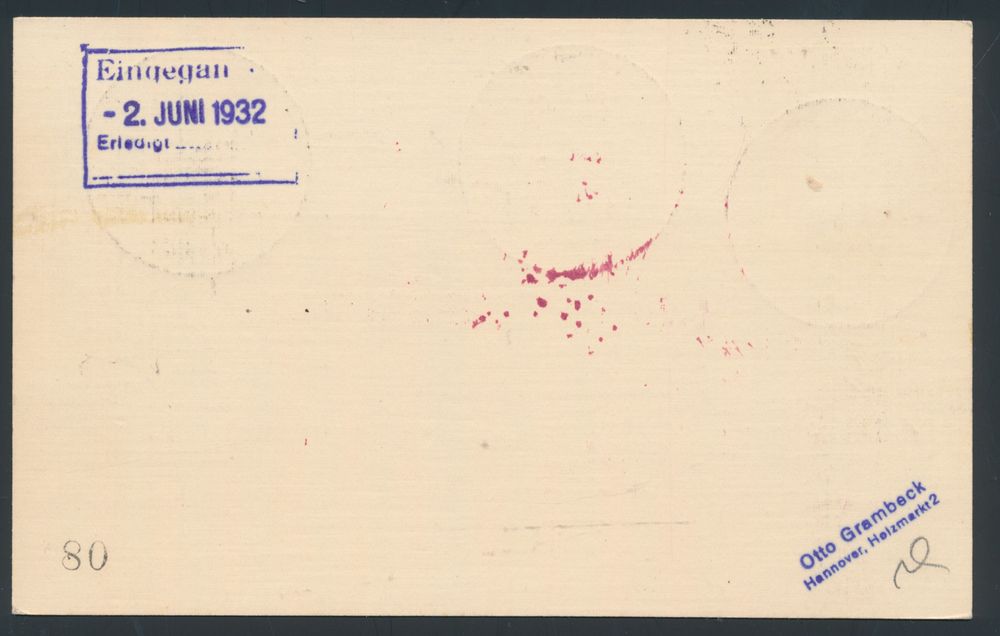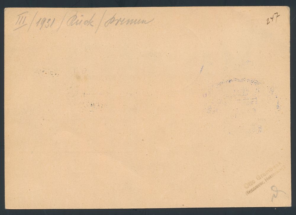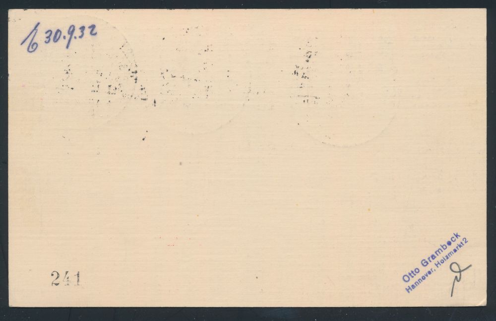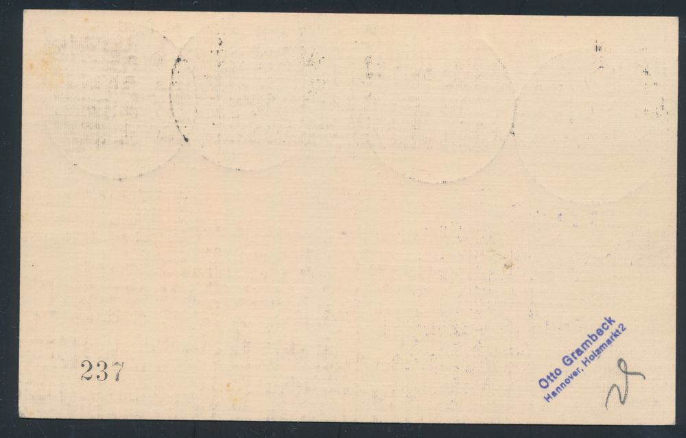 postcard addressed to Hannover and intended to have been launched from the steamer "Bremen", however the flight was cancelled and the mail items prepared for it received one of two special cachets, whereas this postcard has received BOTH cachets in