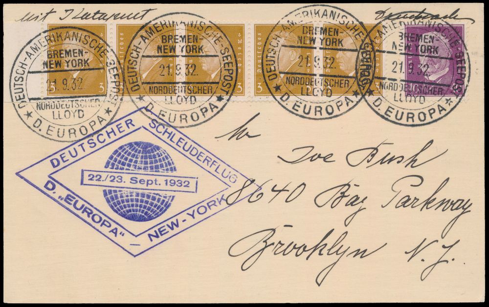 postcard sent to Brooklyn, NY and carried aboard the "Europa", franked with regular stamps all tied by special postmark, catapult flight cachet in blue alongside, vf(Image 1)