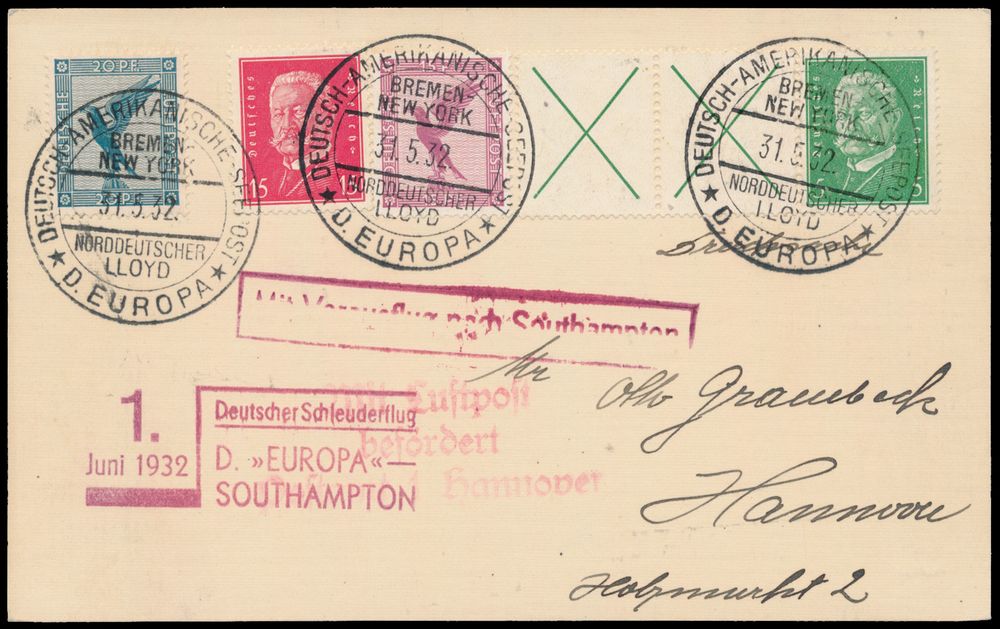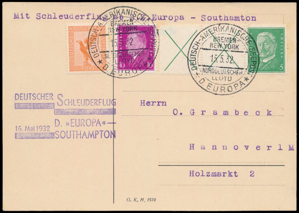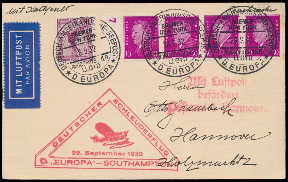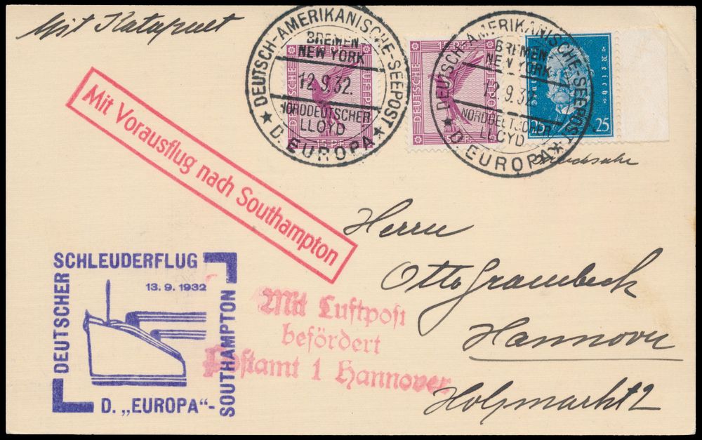 postcard sent to Hannover and carried aboard the "Europa", beairng both airmail and normal stamps all tied by special postmark, catapult flight cachet in red alongside, vf(Image 1)