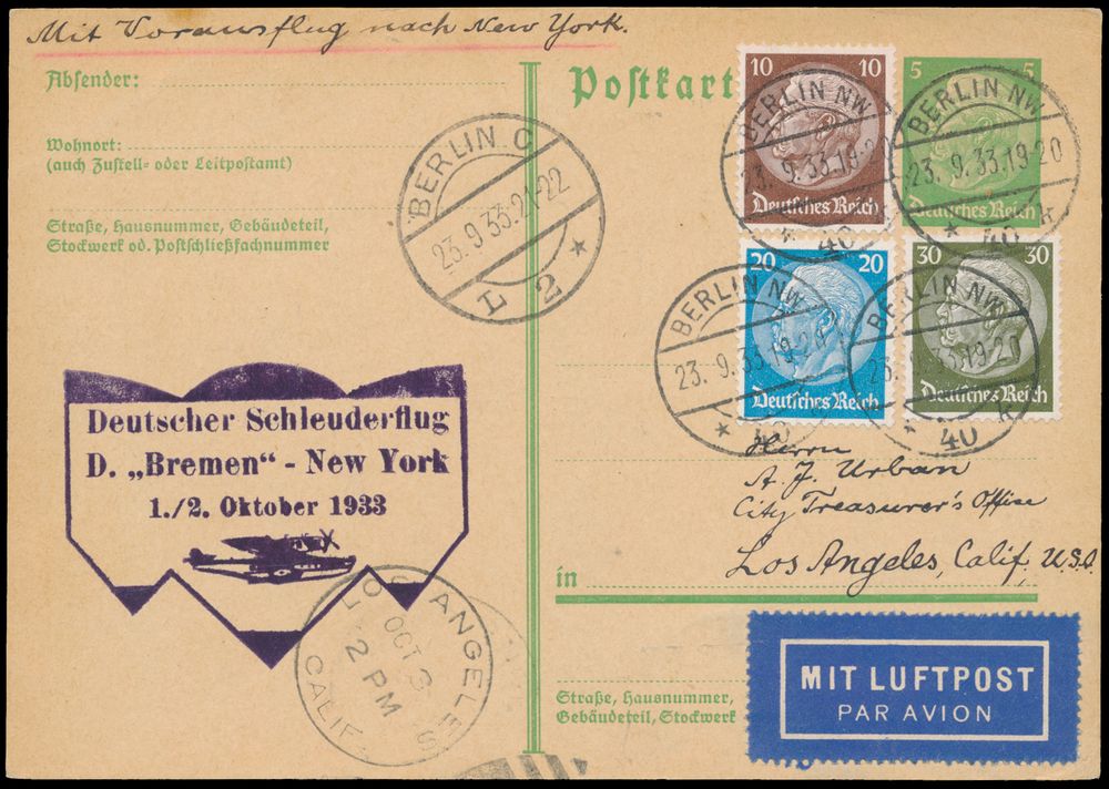5pf postcard sent from Berlin to Los Angeles and carried aboard the "Bremen", up-rated with 3 different Hindenburg values in order to create a 4-colour franking, catapult flight cachet in violet alongside, as well as arrival c.d.s., vf(Image 1)