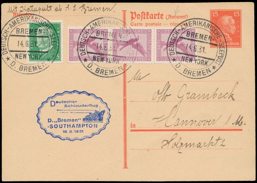 15pf reply postcard (!) addressed to Hannover and carried aboard the "Bremen", bearing both airmail and normal stamps all tied by special postmark, catapult flight cachet in blue alongside, vf(Image 1)