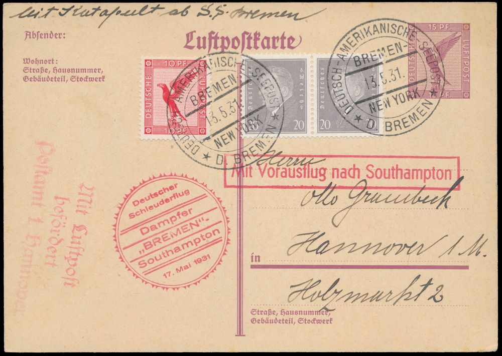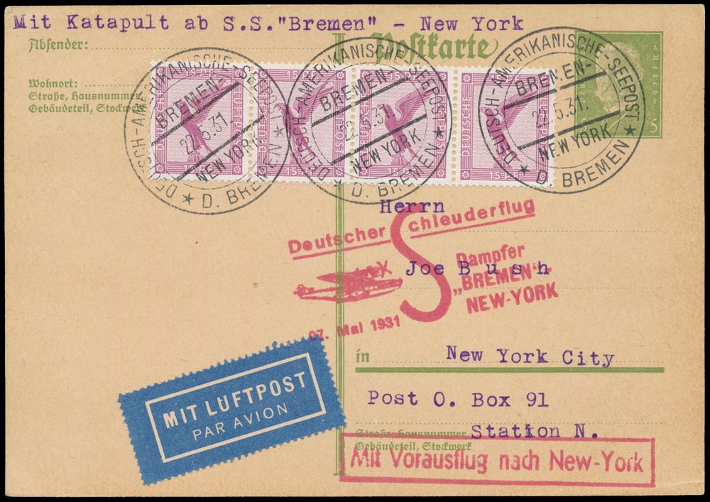 5pf postcard sent to New York and up-rated with a 15pf airmail strip of 4 (Michel A379), carried aboard the "Bremen" and stamps cancelled with the special postmark, catapult flight cachet in red alongside, vf(Image 1)