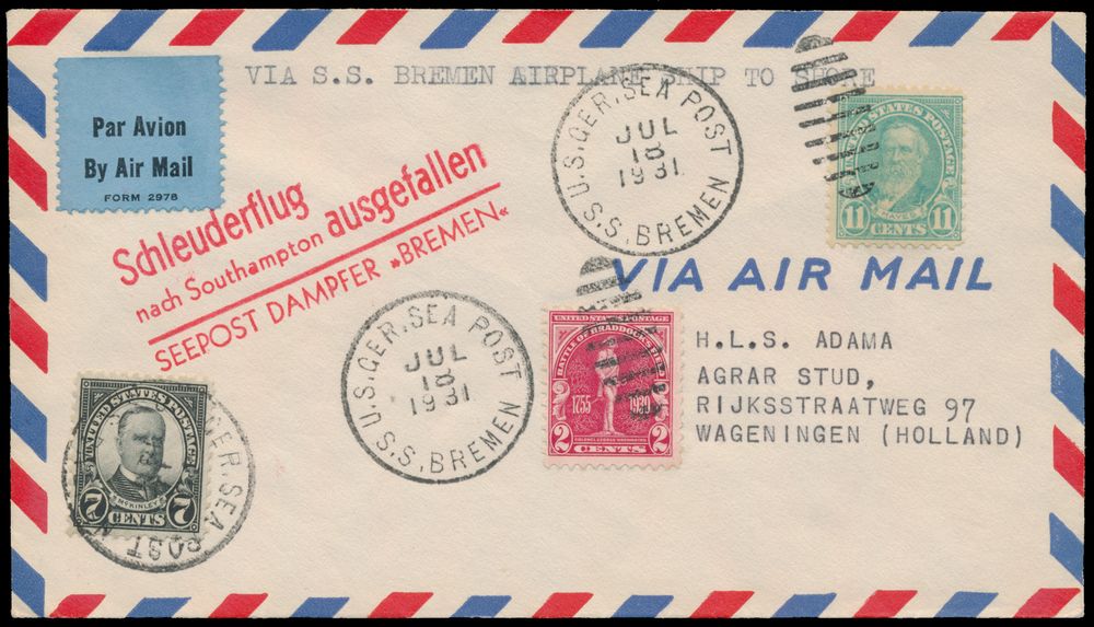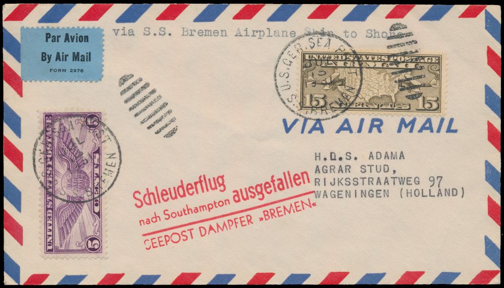 cover addressed to Wageningen, Netherlands and intended to have been launched from the steamer "Bremen", however the flight was cancelled and the mail items prepared for it received a special cachet in carmine, vf(Image 1)