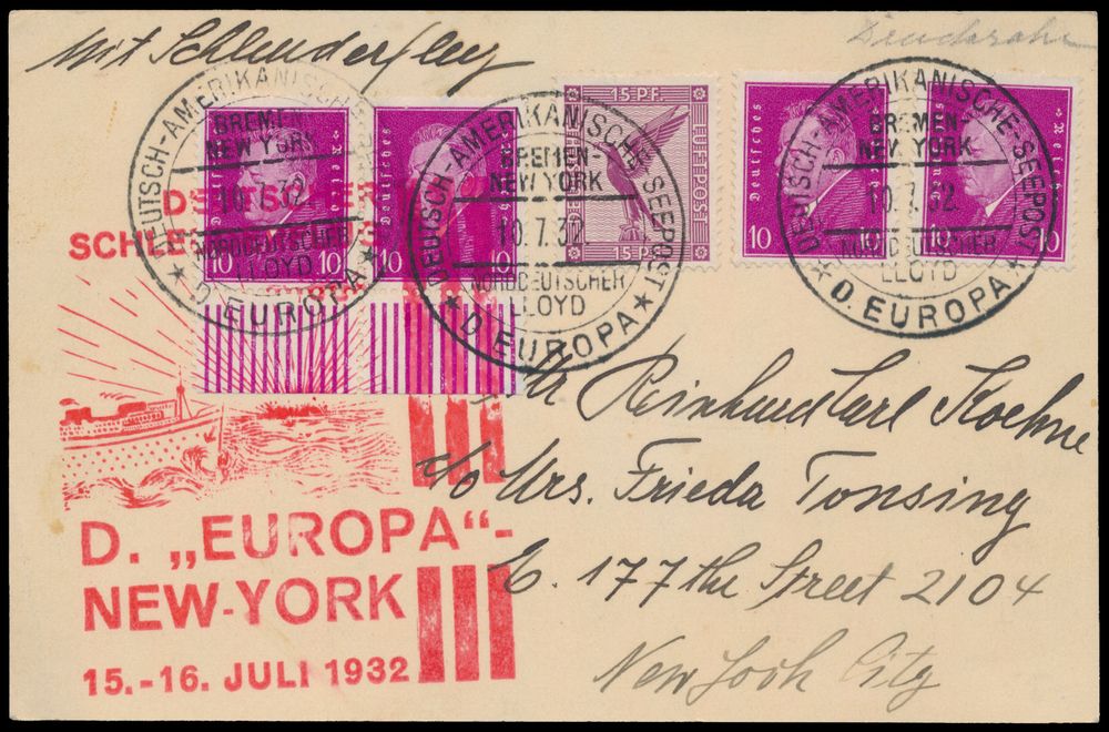 postcard sent to New York and carried aboard the "Europa", beairng both airmail and normal stamps all tied by special postmark, catapult flight cachet in red alongside, vf(Image 1)