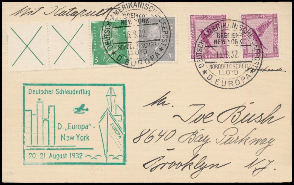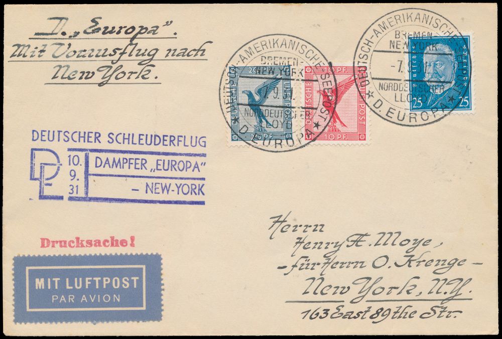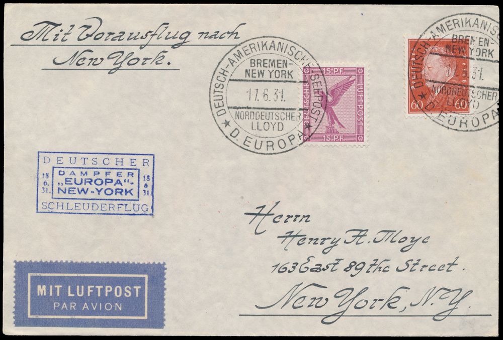 cover sent to New York and carried aboard the "Europa", bearing both airmail and normal franking cancelled with special postmark, catapult flight cachet in blue alongside, vf(Image 1)