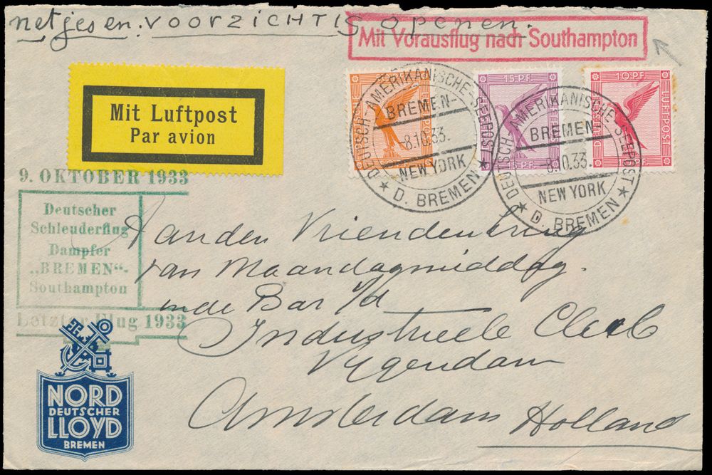 sender initially intended to send via catapult post from the steamer "Bremen" (and thus inscribed it on the front at upper left "Ship to Shore Airmail S.S.Bremen") however, the last catapult flight for the year 1933 from the "Bremen" took place on