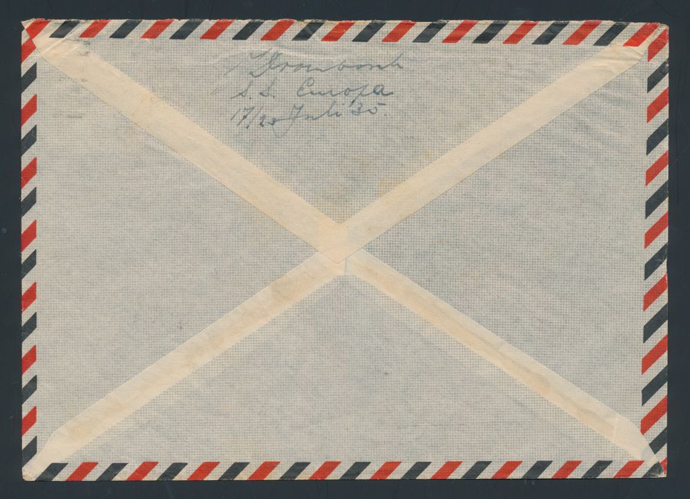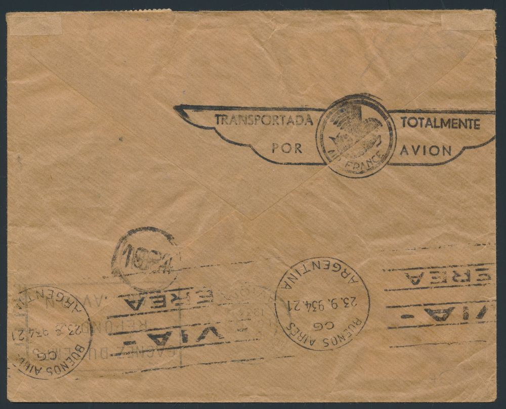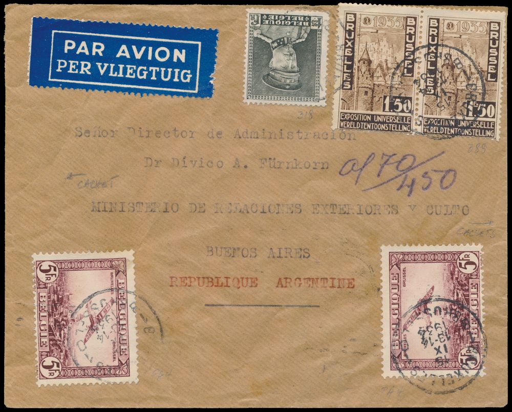 4209 imageBelgium, PA 4 (2x) + 318 + 388 (2x) on letter from Brussels 15.IX.1934 to Buenos Aires, with "TRANSPORTADA TOTALMENTE POR AVION" on the back, vf(Image 1) (Image 2)