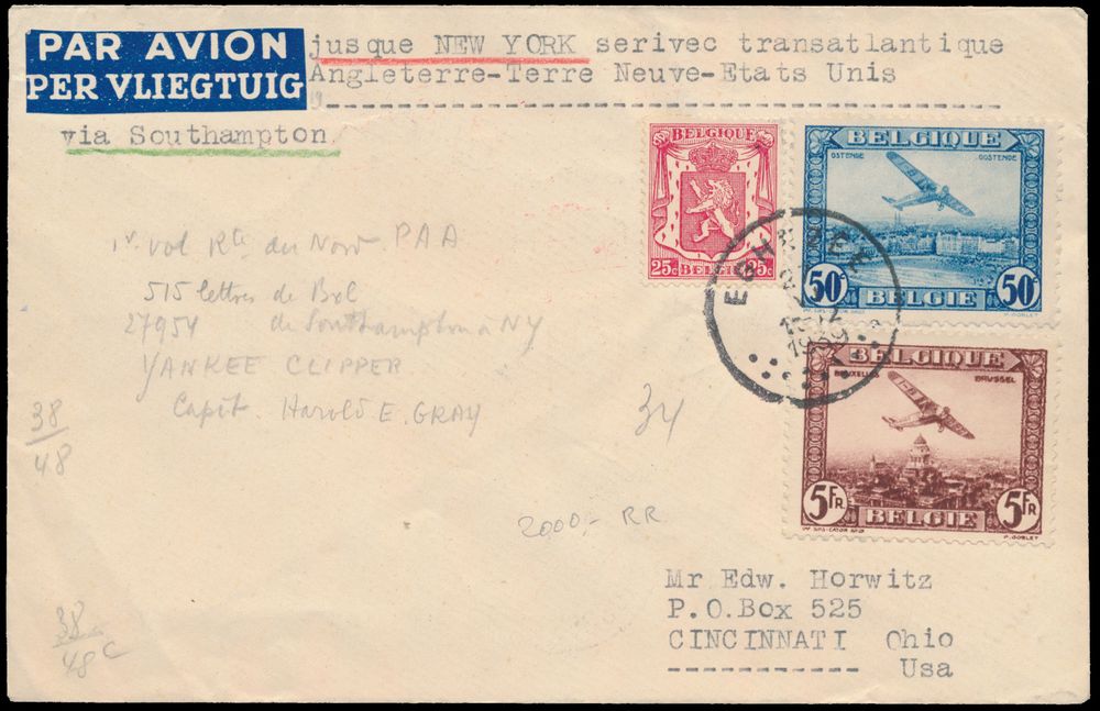 4215 imageBelgium, PA 1 + 4 and n° 423 on letter from Egherer 27.VI.1939 to Cincinnati (Ohio)/USA, via Southampton, vf(Image 1) (Image 2)