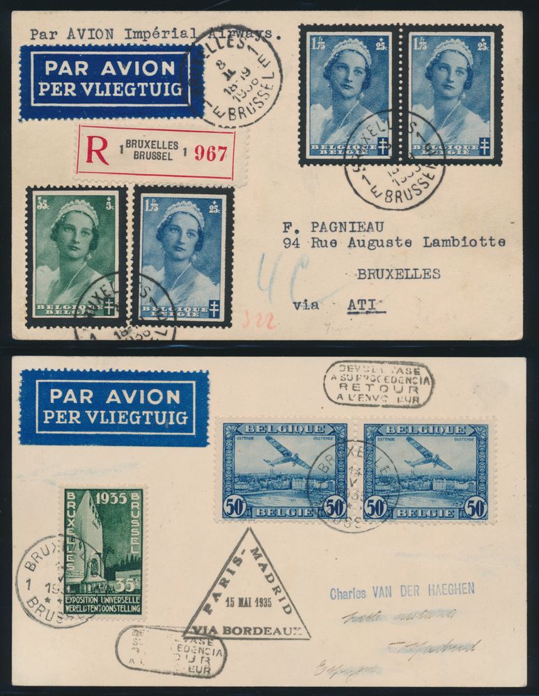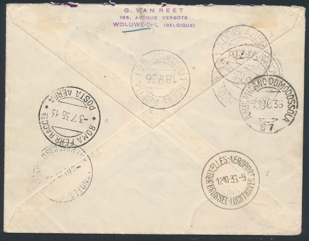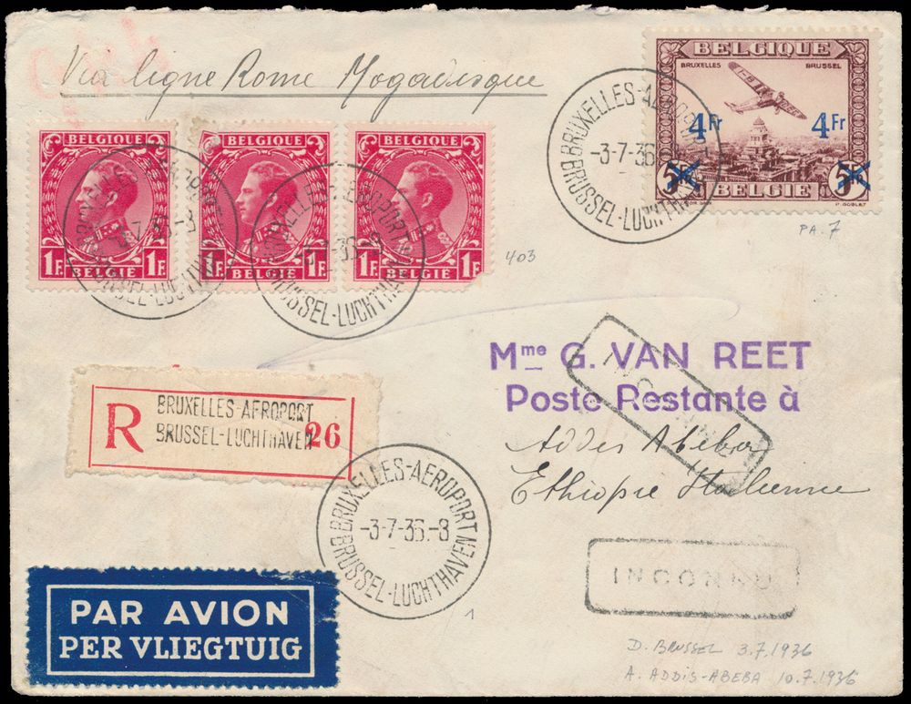 4210 imageBelgium, PA 7 + n° 403 (3x) on registered philatelic letter from Brussels 3-7-35 to Addis Ababa, Ethiopia, returned "INCONNU", vf(Image 1) (Image 2)