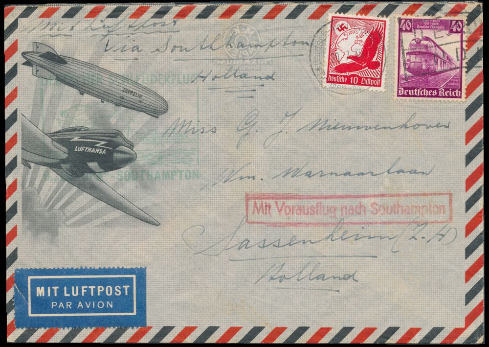4201 image21.7.1935 N° 200c (Mi. Zeppelin Specialised), catapult post illustrated cover addressed to Sassenheim, Netherlands and carried aboard the "Europa", bearing both airmail and normal stamps tied by small-format slogan special postmark, catapult flight cachet in green alongside, vf(Image 1) (Image 2)