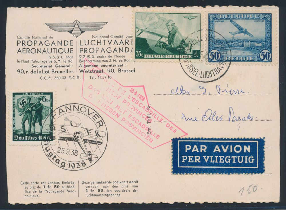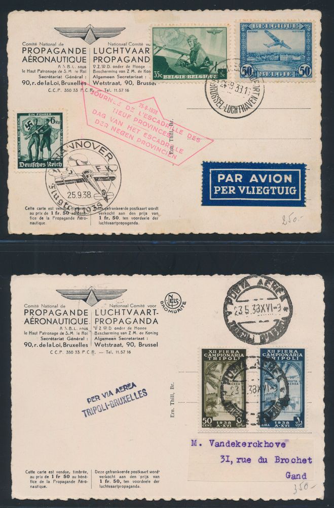 4212 imageBelgium, 3 picture postcards Leopold III aviator, 1938 2x Brussels-Hanover with special postmark 'Day of the Escadrille of the Nine Provinces' and 1x Tripoli-Brussels, vf.(Image 1) (Image 2) (Image 3) (Image 4)
