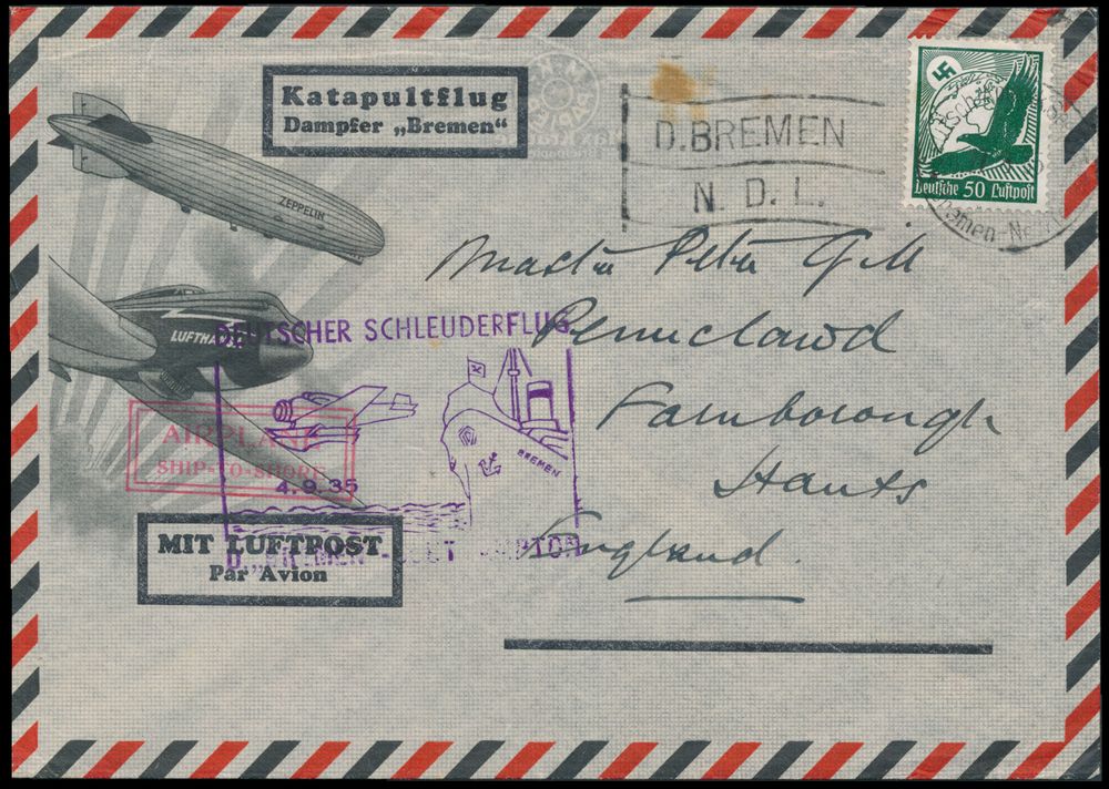 4202 image4.9.1935 N° 210c (Mi. Zeppelin Specialised), catapult post illustrated cover sent to Farnborough, England and carried aboard the "Bremen", franked with 50pf airmail stamp (Michel 535) tied by small-format slogan special postmark, catapult flight cachet in violet alongside, vf(Image 1) (Image 2)