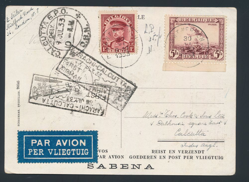 4208 imageBelgium, PA 4 + n° 317, Sabena, ZK Antwerp 30.VII.33, "First airmail, Karachi-Calcutta", 8 July '33, arrival postmark "CALCUTTA 9 JUL 33", vf(Image 1) (Image 2)