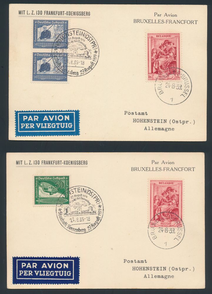 4213 imageBelgium, n° 507 '1fr. Rubens' on 2 philatelic cards, 'Bruxelles-Francfort 24-8-39', 'Mit L.Z. 130 Frankfurt-Koenigsberg' with Reich Mi. stamps n° 669 (2x) and 670, vf(Image 1)
