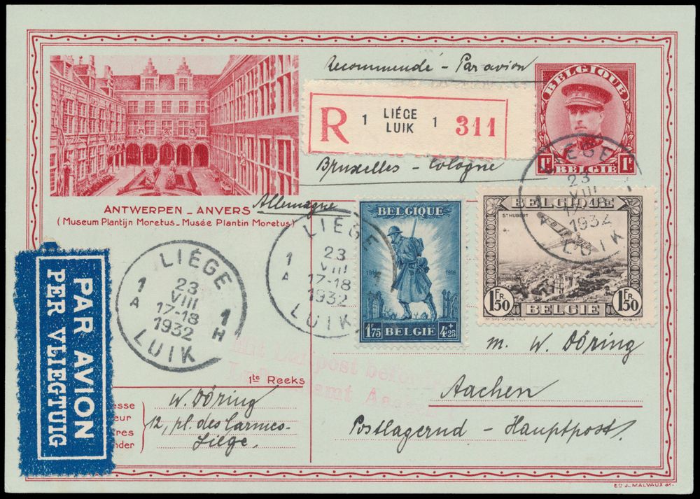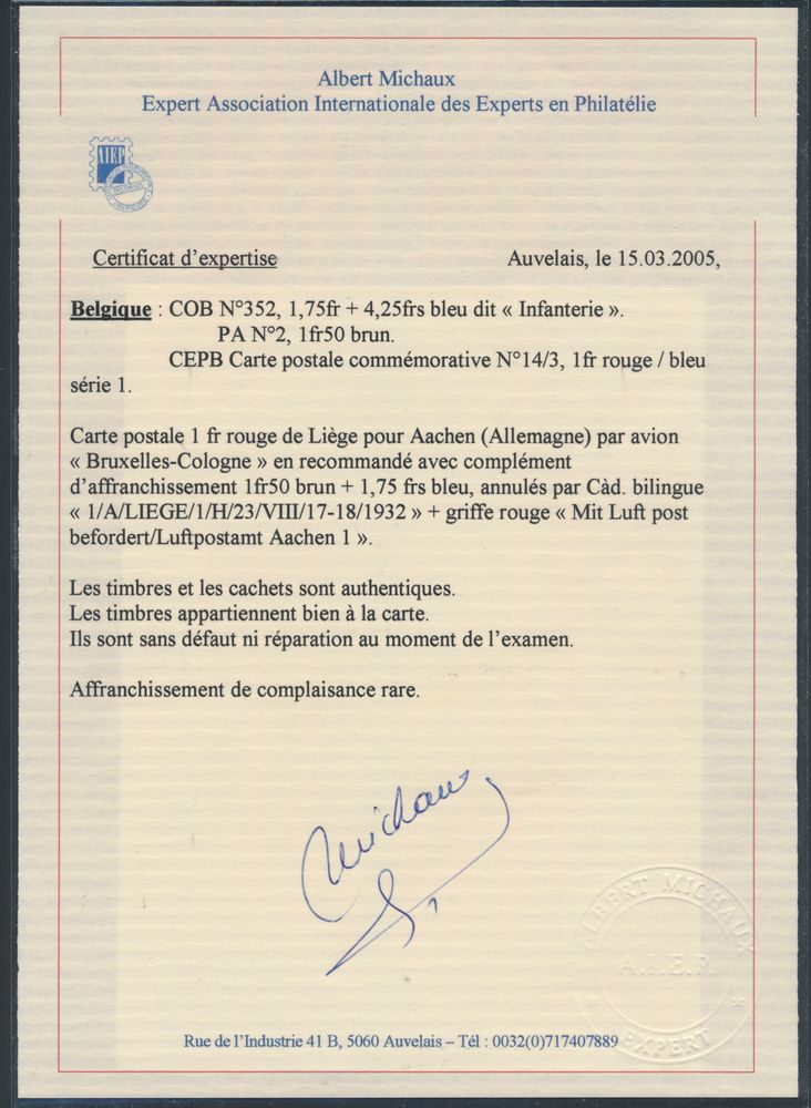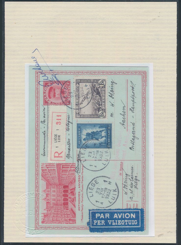 4206 imageBelgium, PA 2 + n° 352 (infantry) on illustrated postcard, registered from Liège 23.VIII.1932 to Aachen, with photo certificate, vf(Image 1) (Image 2) (Image 3) (Image 4)