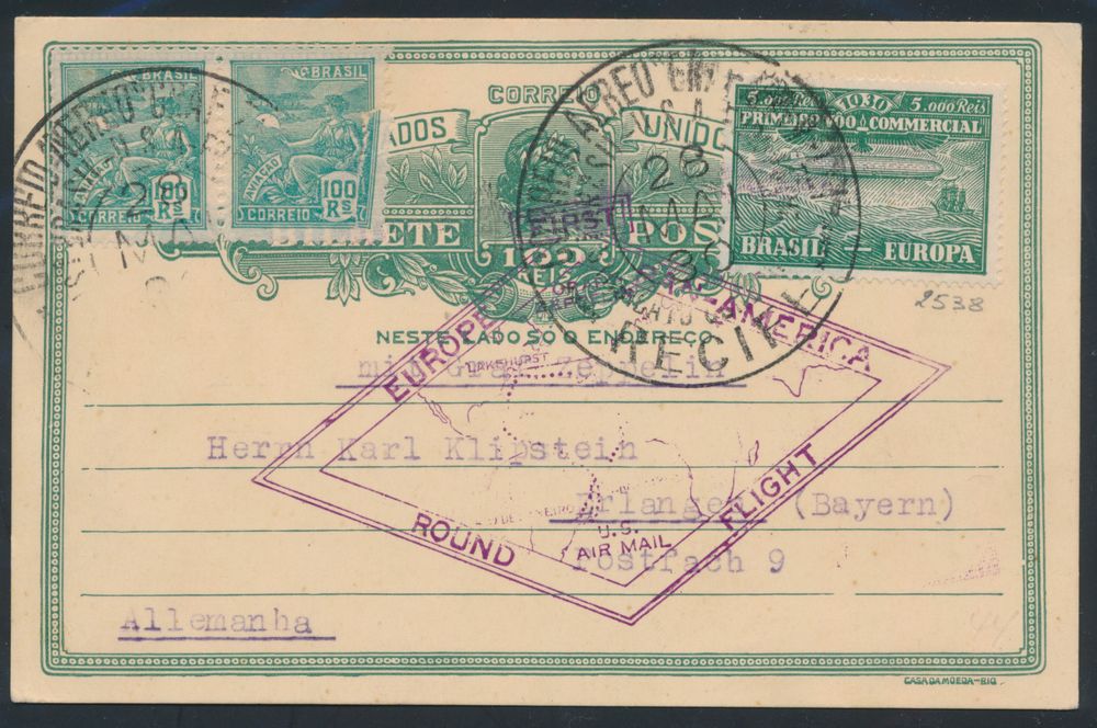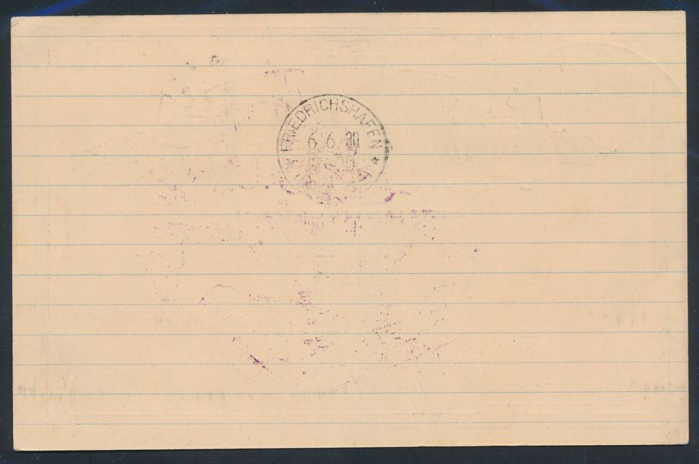 4227 image28.5.1930 N° 68Ba (Mi. Zeppelin Specialised), South America Flight postcard from Recife to Erlangen, Germany, franked with a 5,000r Brazilian zeppelin stamp (Michel Zp. 1) together with a pair of 100r regular stamps, all tied by zeppelin flight cachet in black, "First Europe Pan-America Round Flight" special cachet in violet alongside, Friedrichshafen arrival c.d.s. on reverse, vf(Image 1) (Image 2)