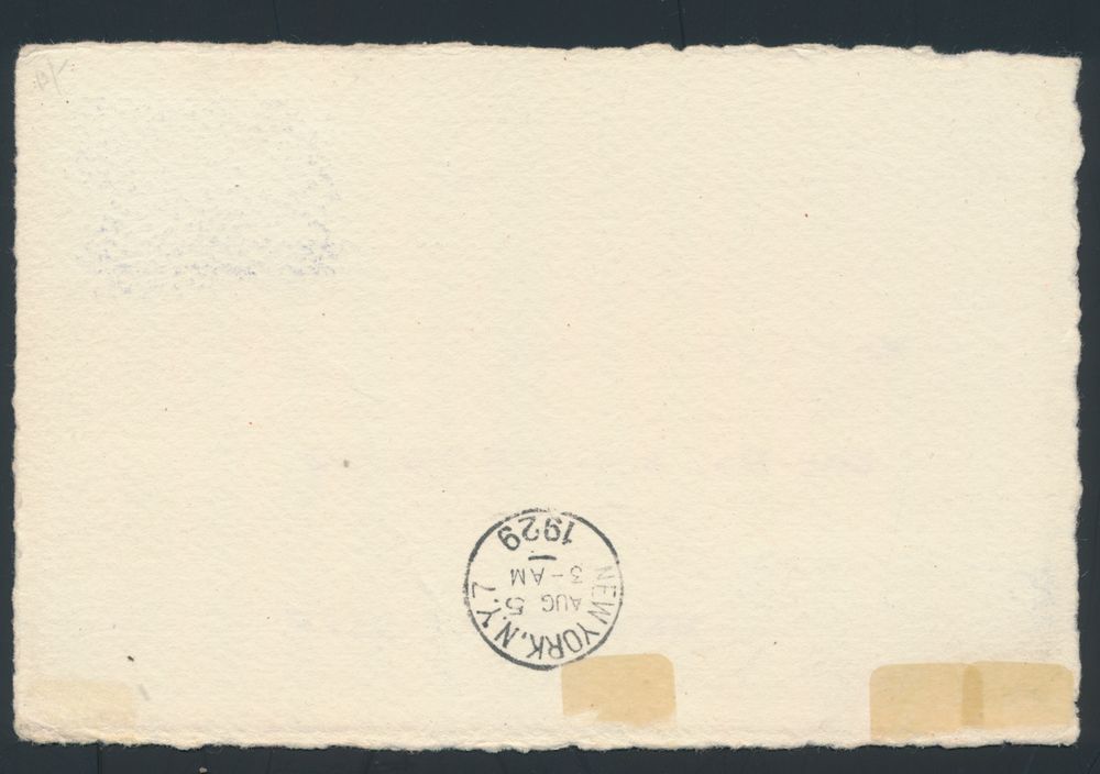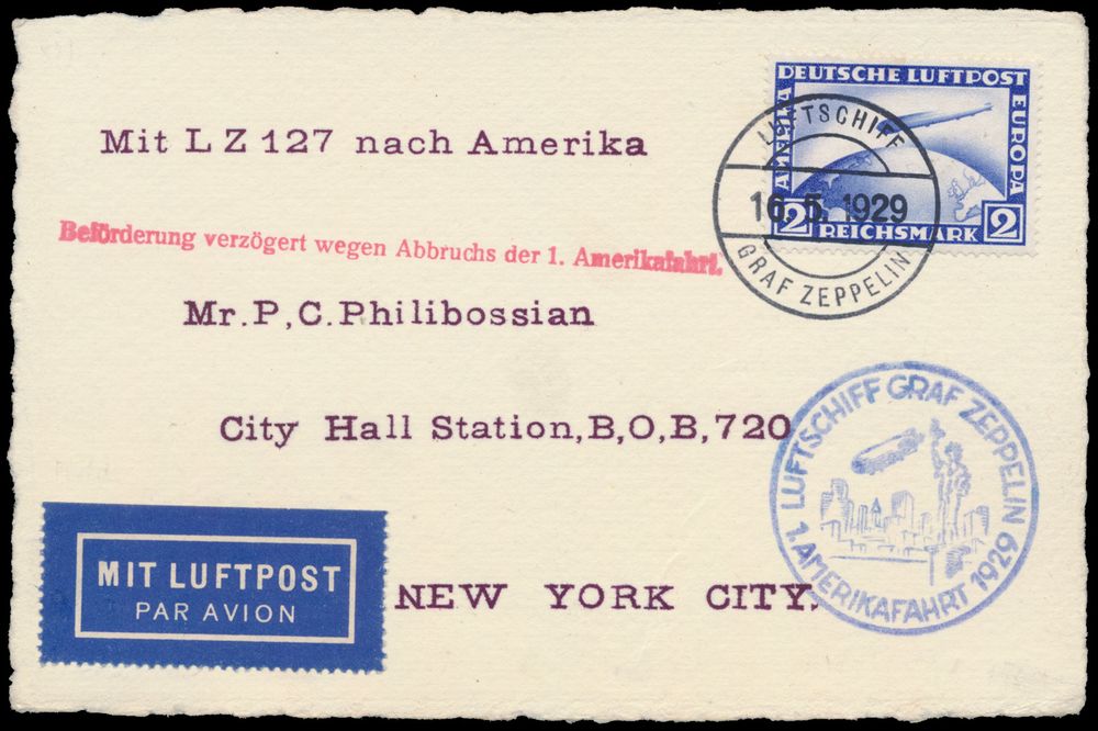 4240 image16.5.1929 N° 23b (Mi. Zeppelin Specialised), LZ 127 Amerikafahrt postcard to New York bearing a 2 RM stamp (Michel 423) tied by Bordpost cancel, zeppelin flight cachet in blue alongside, as well as single-line handstamp in red applied when the airship had to do an emergency landing in Cuers (thus delaying the delivery), arrival c.d.s. on the back, vf(Image 1) (Image 2)