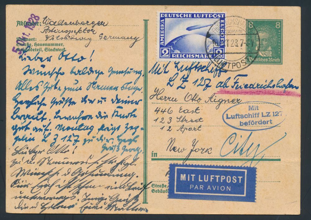 4237 PWST image10.10.1928 LY 127 Amerikafahrt 8pf postcard sent to New Zork and up-rated with a 2 RM stamp (Michel 423) cancelled with Friedrichshafen c.d.s., oval zeppelin flight cachet in blue alongside, horizonal crease well away from the stamps, otherwise very fine aspect, vf(Image 1) (Image 2)