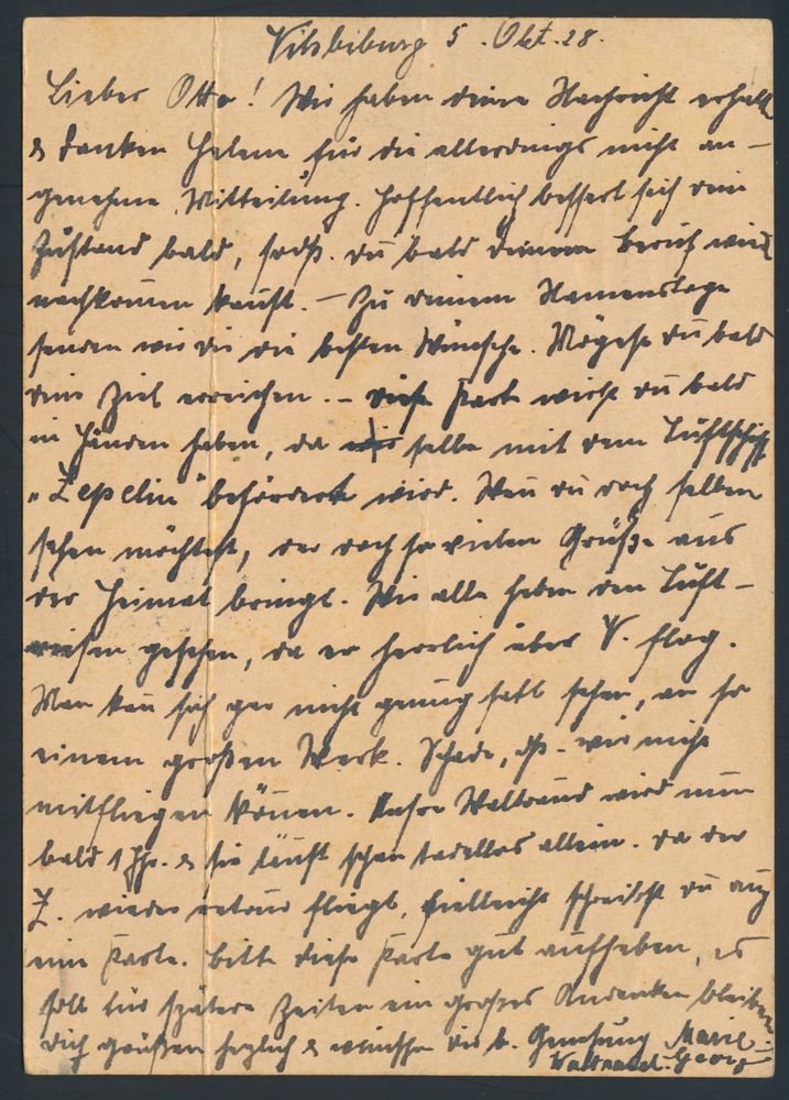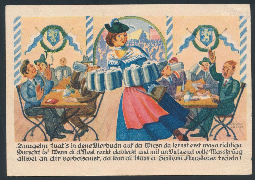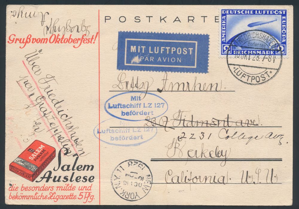 4235 image10.10.1928 N° 7 (Mi. Zeppelin Specialised), LZ 127 Amerikafahrt colour illustrated postcard (Oktoberfest thematic, including cigarettes advertising) sent to Berkeley, California, oval zeppelin flight cachet in blue applied twice, New York transit postmark, franked with a 2 RM stamp (Michel 423), faint creasing, vf(Image 1) (Image 2)