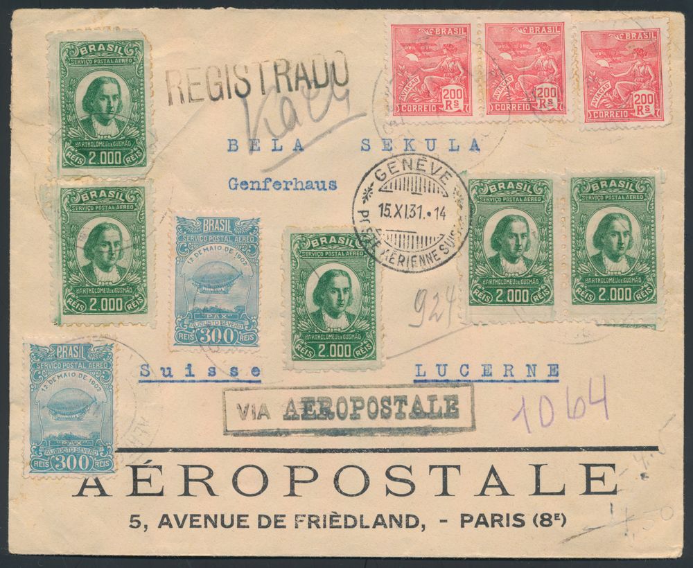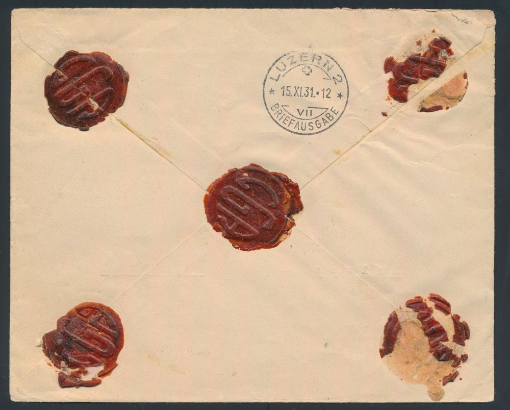 4228 image15.11.1931 airmail cover sent registered to Lucerne, Switzerland and displaying a colourful airmail franking, transit and arrival postmarks on both front and back, as well as framed "VIA AEROPOSTALE" handstamp, vf(Image 1) (Image 2)