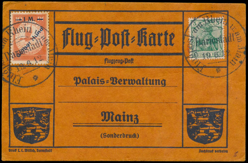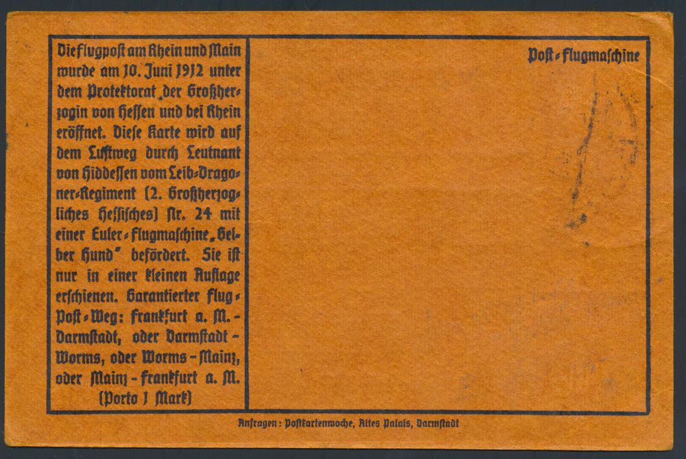4232 image19.6.1912 airmail postcard sent from Darmstadt to Mainz and franked with the 1M on 10pf Gelber Hund overprinted stamp (Michel IV, cat. value €280 on cover), as well as a regular 5pf stamp, uncommon, vf(Image 1) (Image 2)