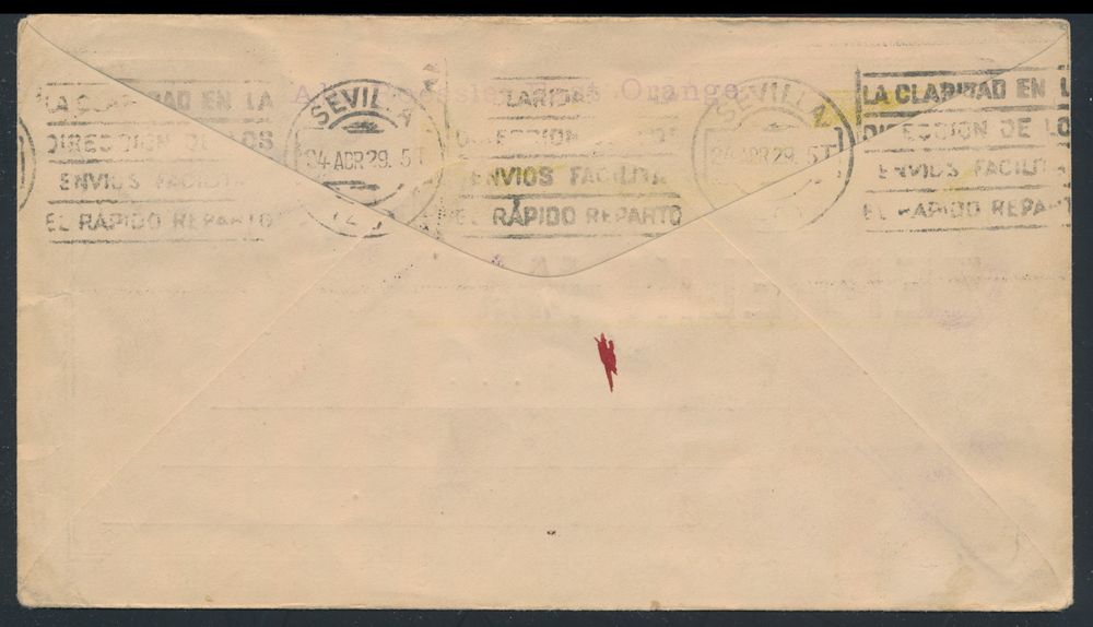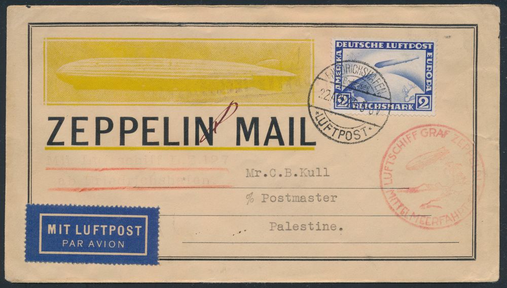 4239 image22.4.1929 N° 20Ia (Mi. Zeppelin Specialised), LZ 127 Mediterranean Flight - Seville drop-off illustrated cover addressed to "Palestine" (although it is not very clear what the sender meant by this, as no city is indicated), bearing a 2 RM stamp (Michel 423) tied by Friedrichshafen c.d.s., zeppelin flight cachet in red alongisde on the front and Sevilla landing postmark on the back, vf(Image 1) (Image 2)