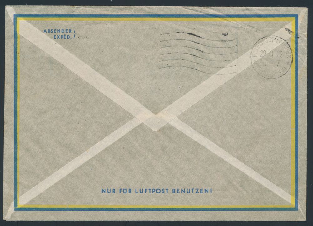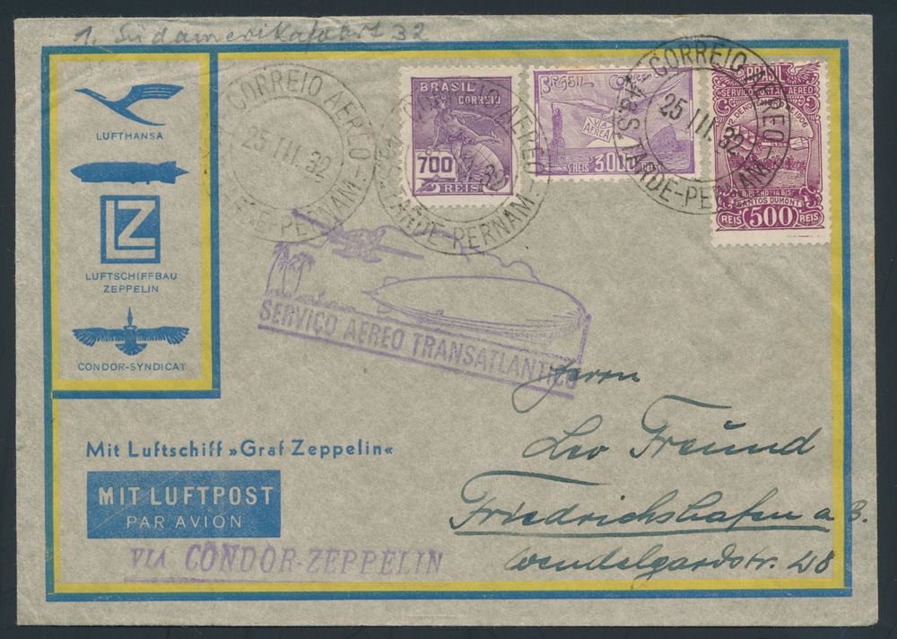 4229 image25.3.1932 N° 235Aa (Mi. Zeppelin Specialised), LZ 127 South America Flight cover sent to Friedrichshafen and franked with both airmail and regular stamps, zeppelin flight cachet alongside on the front and Friedrichshafen arrival c.d.s. on the back, vf(Image 1) (Image 2)