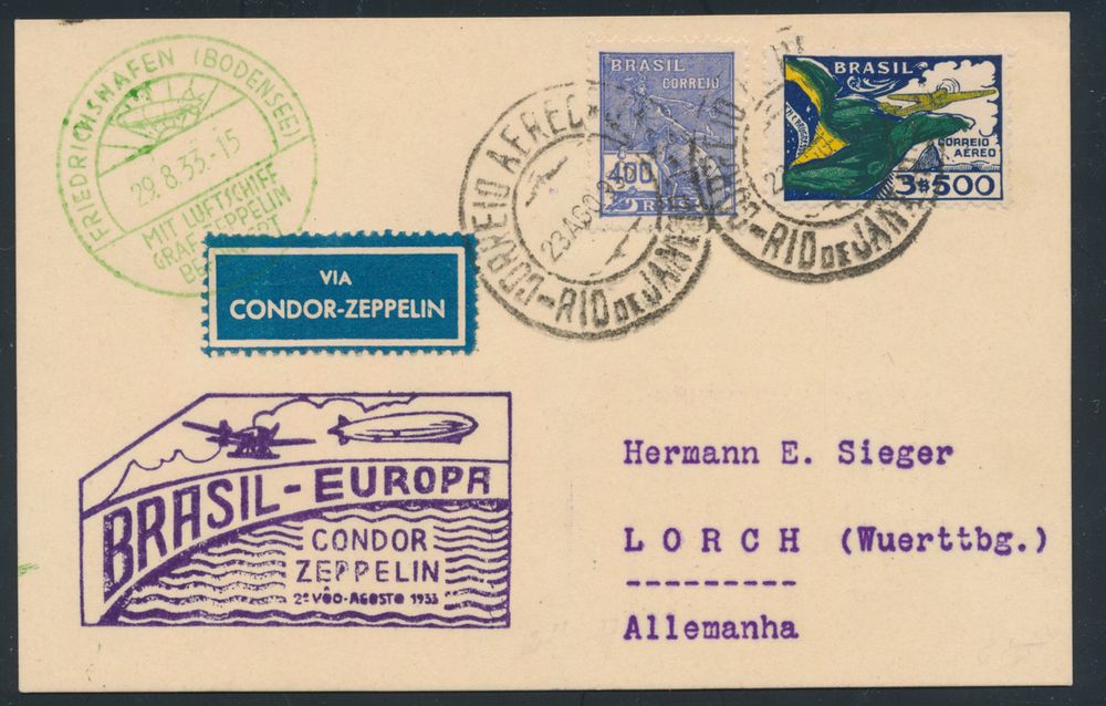 4230 image23.8.1933 N° 133Aa (Mi. Zeppelin Specialised), LZ 127 South America Flight postcard sent on the return leg from Rio de Janeiro to Lorch, Germany and bearing regular Brazilian franking, zeppelin flight cachet in violet, special landing Friedrichshafen postmark in green alongside, great quality, vf(Image 1) (Image 2)