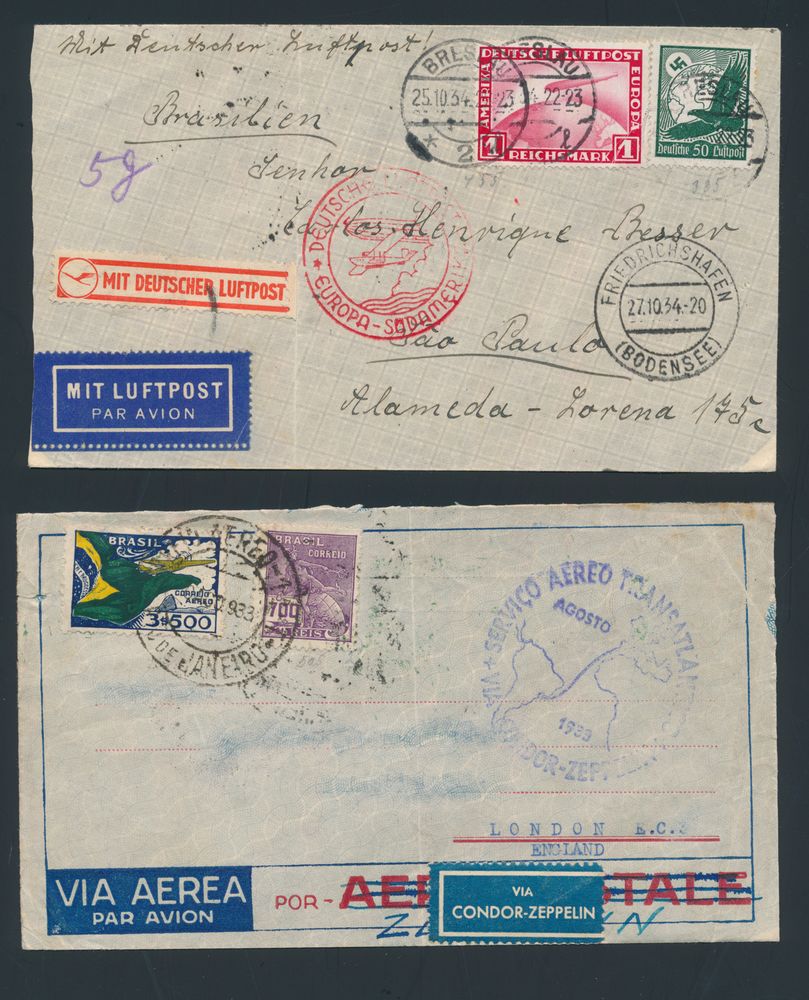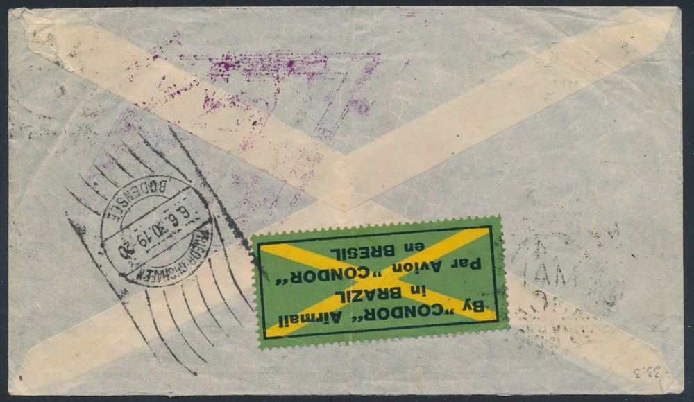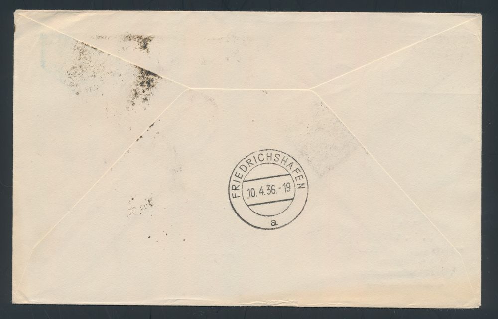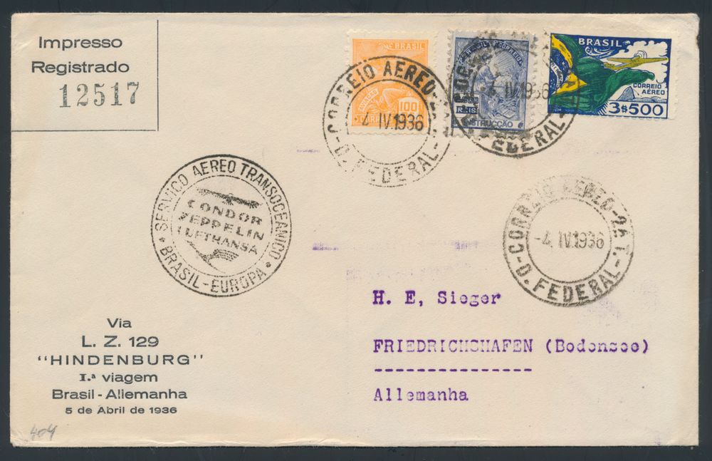 4231 image4.4.1936 N° 10A (Mi. Zeppelin Specialised), LZ 129 Brazilian cover sent to Friedrichshafen and bearing colourful Brazilian franking, special zeppelin flight cachet alongside on the front and German arrival c.d.s. on the back, vf(Image 1) (Image 2)