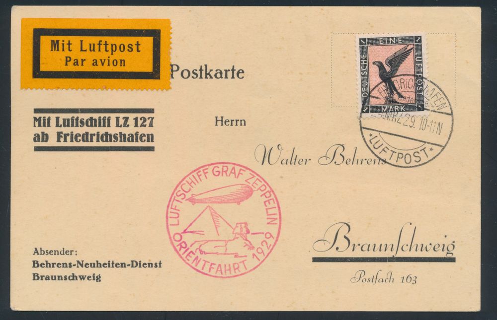 4238 image24.3.1929 N° 18Ia (Mi. Zeppelin Specialised), LZ 127 Orientfahrt postcard addressed to Braunschweig and bearing a 1M stamp (Michel 382) tied by Friedrichshafen cancel, with zeppelin flight cachet in carmine alongside, vf(Image 1) (Image 2)