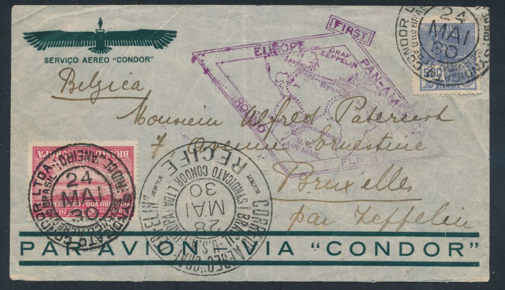 4226 image24.5.1930 N° 68Bb (Mi. Zeppelin Specialised), South America Flight cover from Rio de Janeiro to Brussels, Belgium, franked with a 10,000r Brazilian zeppelin stamp (Michel Zp. 2) together with a regular 500r stamp, both tied by special postmark, with zeppelin flight cachet in black and "First Europe Pan-America Round Flight" special cachet in violet alongside on the front, Friedrichshafen arrival c.d.s. on the back, some creasing but overall very fine, vf(Image 1) (Image 2)