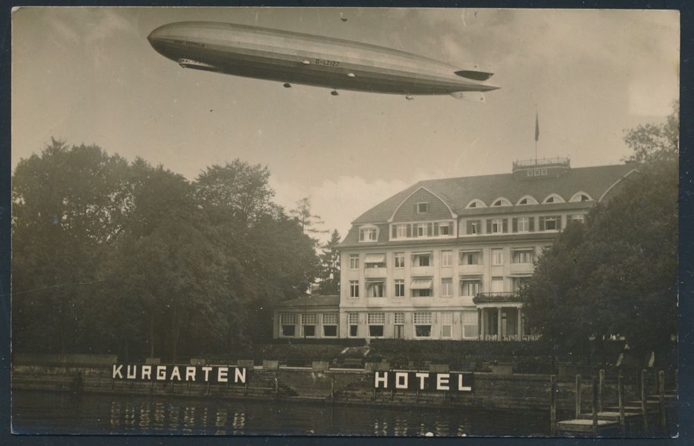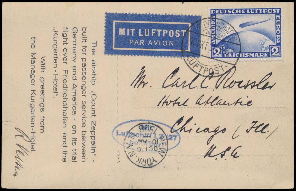 4236 image10.10.1928 N° 7 (Mi. Zeppelin Specialised), LZ 127 Amerikafahrt photo postcard advertising in English for the Kurgarten Hotel, sent to Chicago and franked with a 2 RM stamp (Michel 423), oval zeppelin flight cachet in blue and New York transit postmark, an uncommon card, vf(Image 1) (Image 2)
