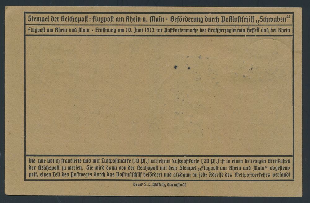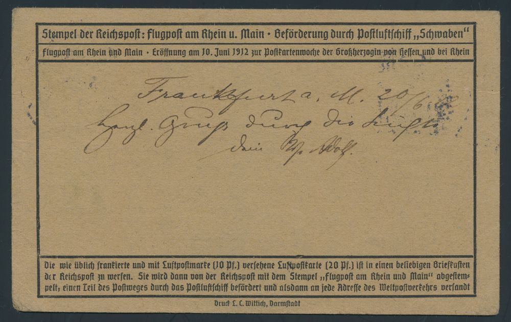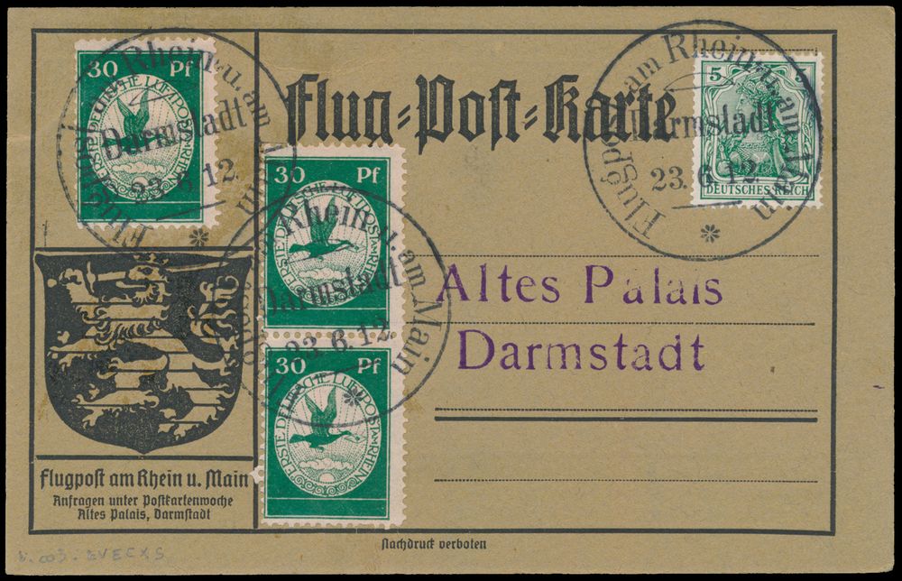 4233 bl image1912 Darmstadt airmail card with ‘Germania 5pf.’ and ‘Flugpost III 30pf. green’ (3x) including pair, vf (Mi. €400)(Image 1) (Image 2)