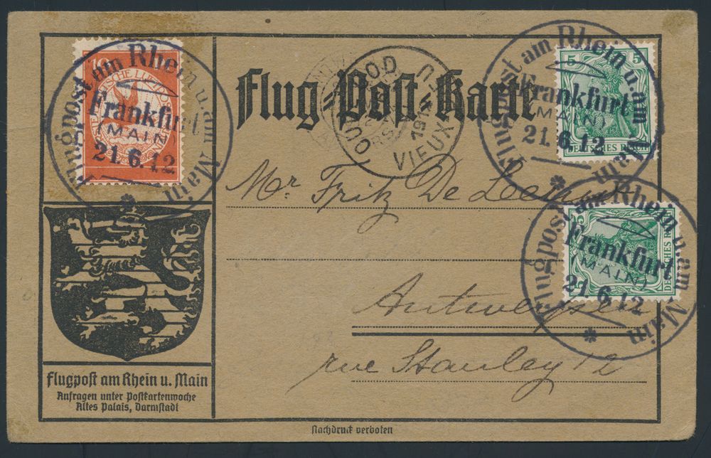 4234 image21.6.1912 airmail postcard sent from Frankfurt to Antwerp, Belgium and franked with the 10pf orange stamp (Michel I) in addition to two 5pf regular stamps, transit and arrival postmarks alongside, which prove that the card did indeed travel to Belgium, vf(Image 1) (Image 2)