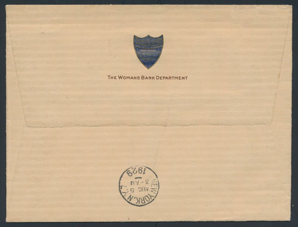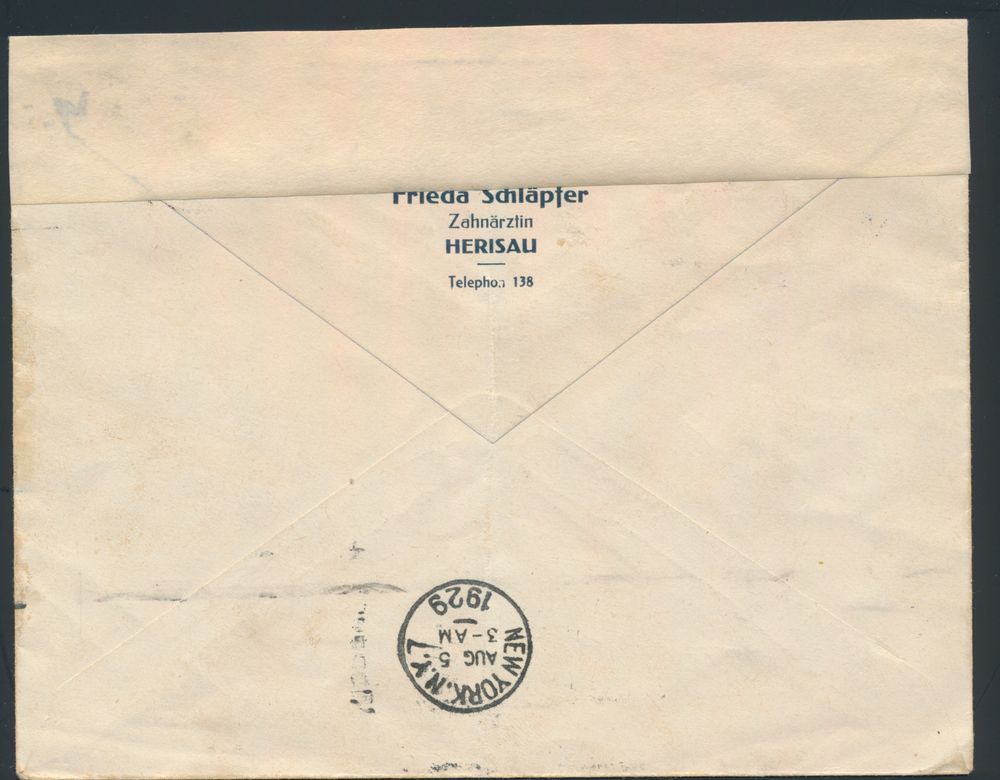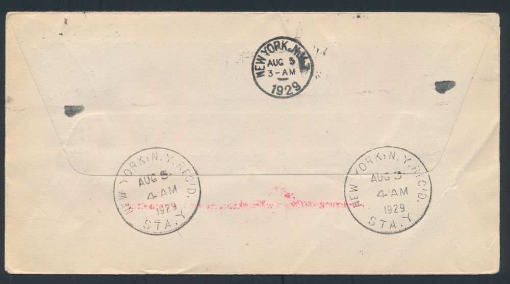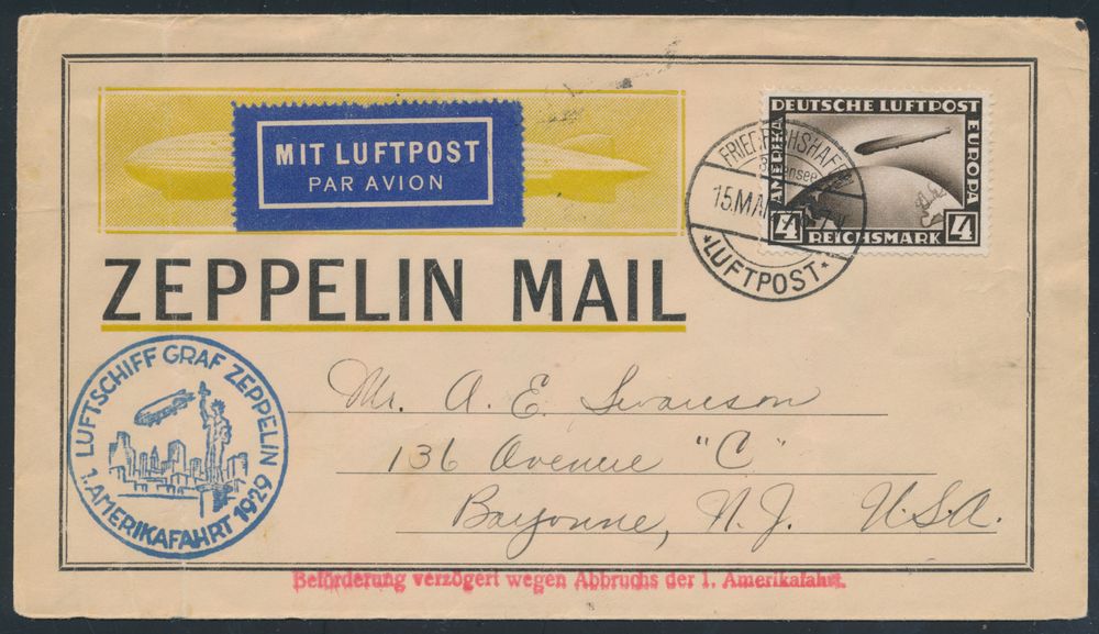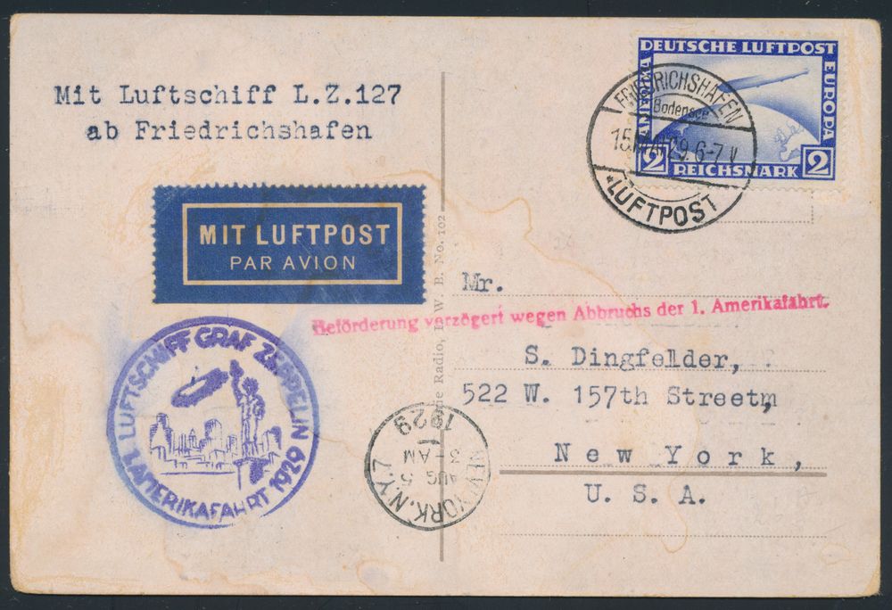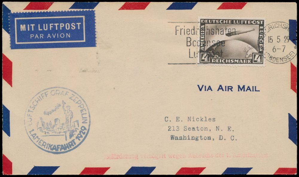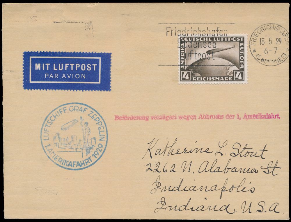 4244 image15.5.1929 N° 23a (Mi. Zeppelin Specialised), LZ 127 Amerikafahrt cover sent to Indianapolis, IN and franked with a 4 RM stamp (Michel 424) tied by a Friedrichshafen slogan postmark, zeppelin flight cachet in blue also present on the front, alongside "Beförderung verzögert wegen Abbruchs der 1. Amerikafahrt." single-line handstamp in red, indicating that the cover was flown on the fateful flight of 16.5 which had to do an emergency landing in Cuers (South-Eastern France), arrival c.d.s. on the back, great quality, vf(Image 1) (Image 2)