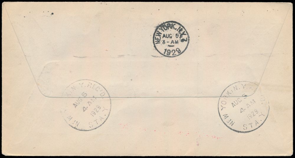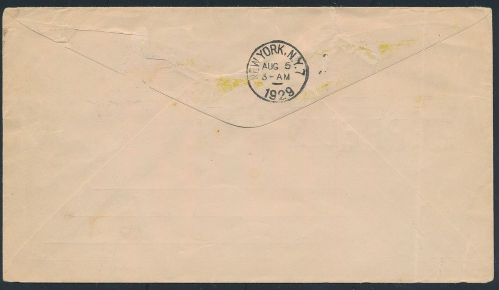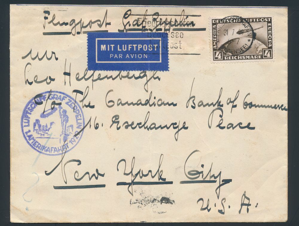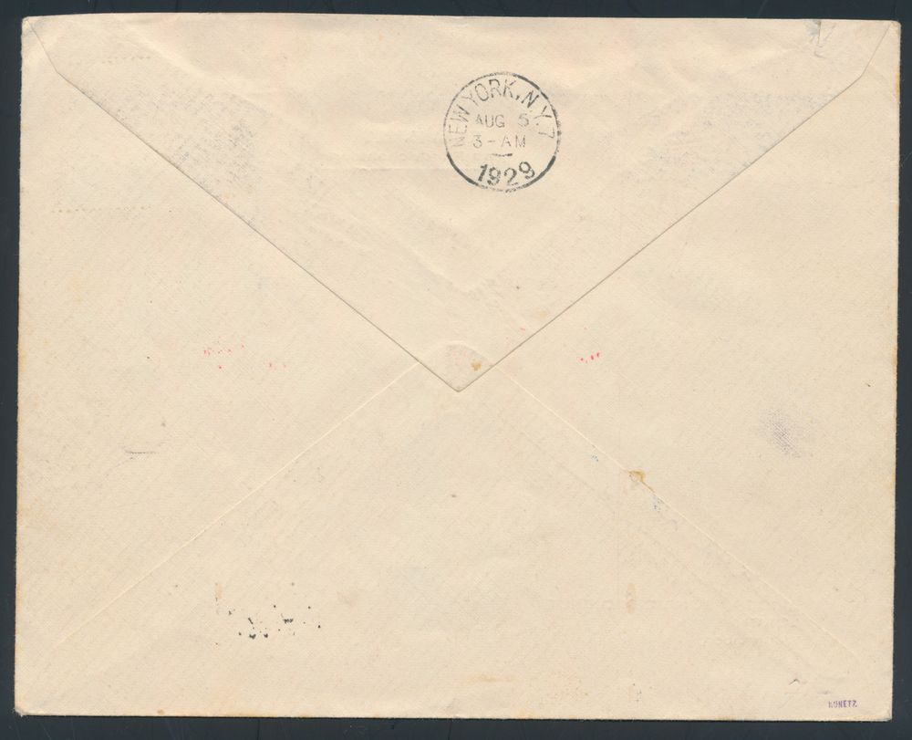 4250 image31.7.1929 N° 27a (Mi. Zeppelin Specialised), LZ 127 Amerikafahrt cover to New York franekd with a 4 RM stamp (Michel 424) tied by Friedrichshafen slogan postmark, zeppelin flight cachet in blue alongside, vertical filing fold well away from the stamp, arrival c.d.s. on reverse, vf(Image 1) (Image 2)
