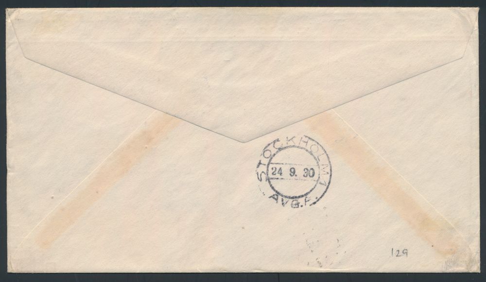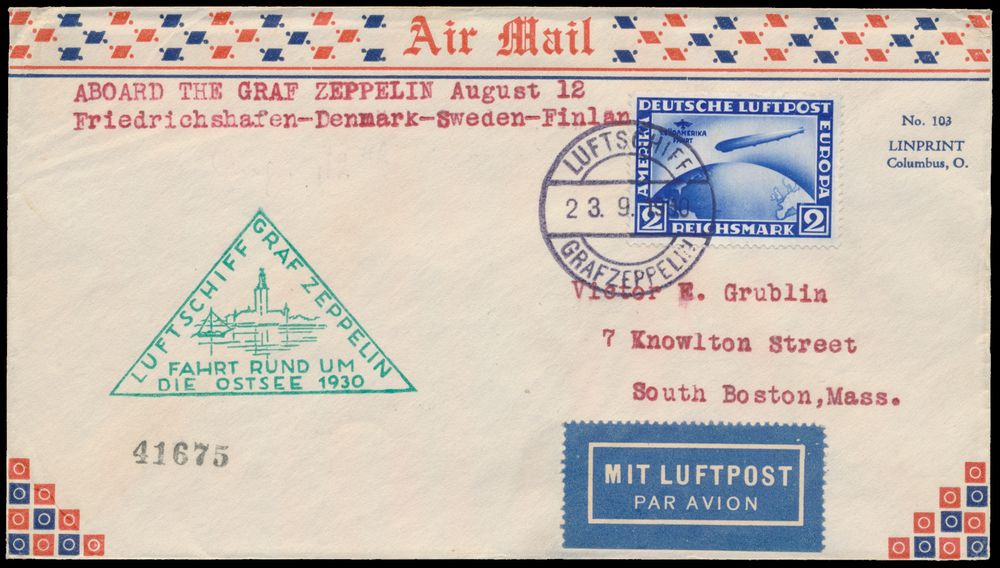 4260 image23.9.1930 N° 128IVc (Mi. Zeppelin Specialised), LZ 127 Ostseefahrt - Stockholm drop-off cover addressed to Boston, Massachusetts and franked with a 2 RM South America Zeppelin Flight stamp (Michel 438, cat. value €500 for the stamp on cover) tied by Bordpost cancel, zeppelin flight cachet alongside on the front in green, Stockholm arrival postmark on the back, it is not clear whether the cover did actually travel to the US afterwards and there is a possibility (judging by the typewritten indication at upper left) that the envelope was actually prepared for a previous flight and not used then, vf(Image 1) (Image 2)