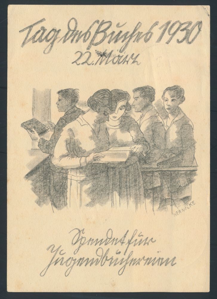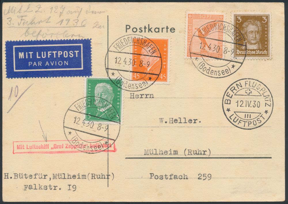4253 image12.4.1930 N° 53Ia (Mi. Zeppelin Specialised), LZ 127 Swiss Flight - Bern drop-off illustrated postcard addressed to Mülheim an der Ruhr, Germany and franked for a total of 1M3pf with normal and airmail stamps, Friedrichshafen departure c.d.s. and Bern arrival postmark, as well as framed zeppelin handstamp, vf(Image 1) (Image 2)