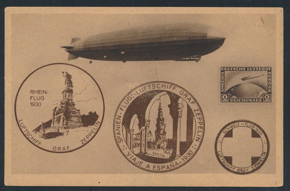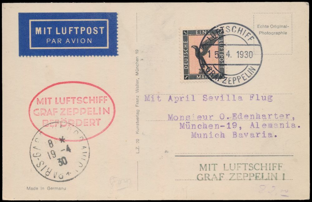 4254 image15.4.1930 N° 54b (Mi. Zeppelin Specialised), LZ 127 Spanish Flight photo postcard addressed to Munich and bearing a 1M stamp (Michel 382) tied by Bordpost cancel, oval auxiliary zeppelin handstamp "MIT LUFTSHIFF GRAF ZEPPELIN BEFÖRDERT" in red alongside, as well as Paris transit c.d.s. dated 19.4 (the airship landed in Seville on 16.4, and the card had to travel to Munich afterwards), the photo side is particularly interesting, showing a skillful collage of, amongst other things, the hangars in Friedrichshafen and a German zeppelin stamp, vf(Image 1) (Image 2)