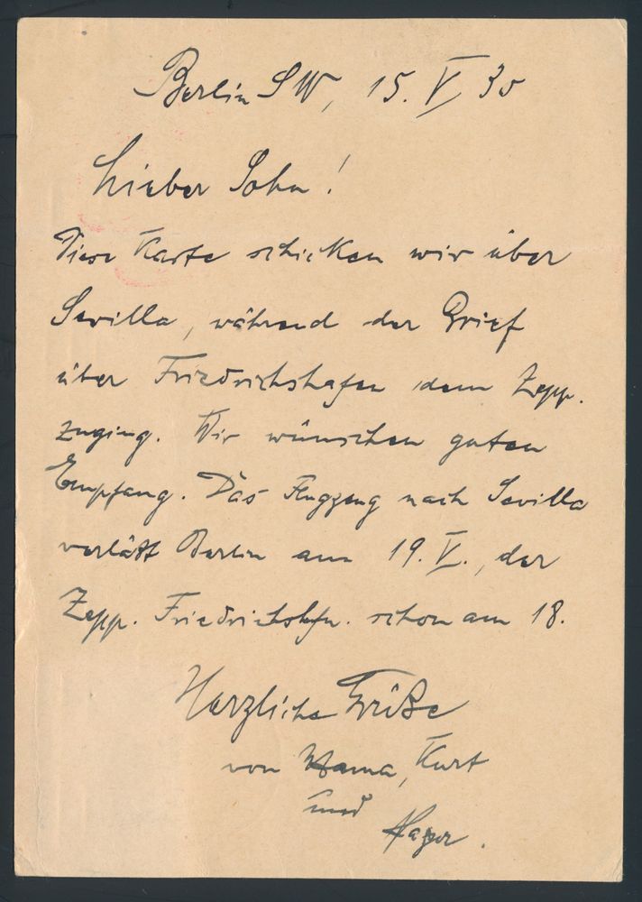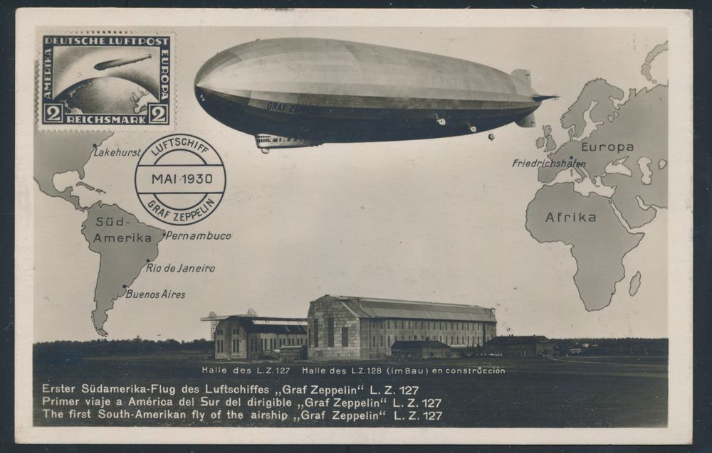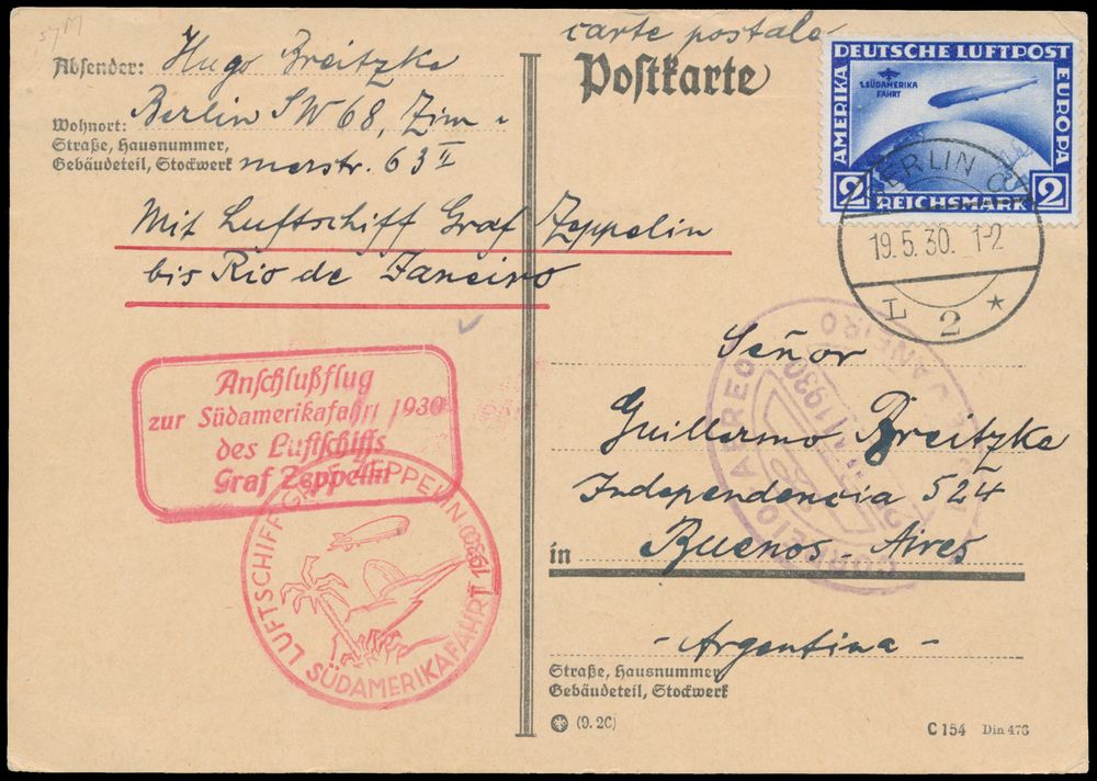 4257 image19.5.1930 N° 64c (Mi. Zeppelin Specialised), LZ 127 South America Flight postcard sent from Berlin to Buenos Aires, Argentina and franked with a 2 RM South America Zeppelin Flight stamp (Michel 438, cat. value €500 for the stamp on cover) tied by Berlin c.d.s., zeppelin flight cachet as well as special cachet for the flight from Berlin to Friedrichshafen (the point of departure for the airship) both in carmine on the front, Rio de Janeiro arrival postmark dated 25.5.1930 alongside in violet, a scarce card, vf(Image 1) (Image 2)