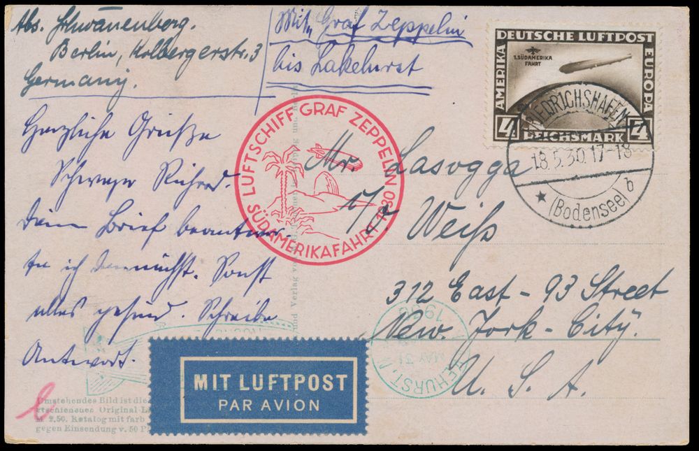 4256 image18.5.1930 N° 62a (Mi. Zeppelin Specialised), LZ 127 South America Flight postcard sent to New York and bearing a 4 RM South America Zeppelin Flight stamp (Michel 439, cat. value €500 for the stamp on cover) tied by Friedrichshafen cancel, zeppelin flight cachet alongside in carmine as well as Lakehurst, NJ arrival duplex in green (dated 31.5), vf(Image 1) (Image 2)